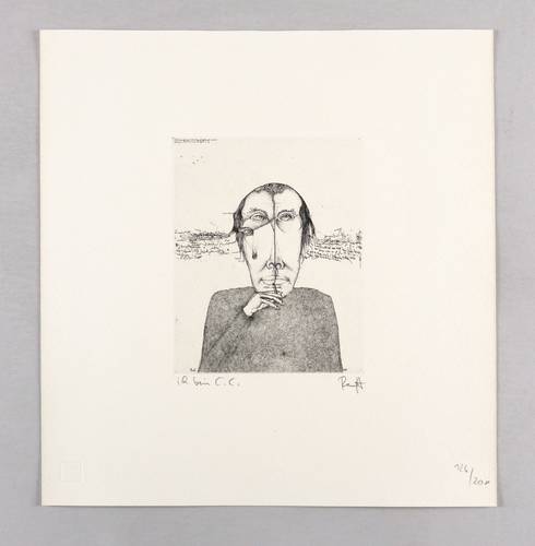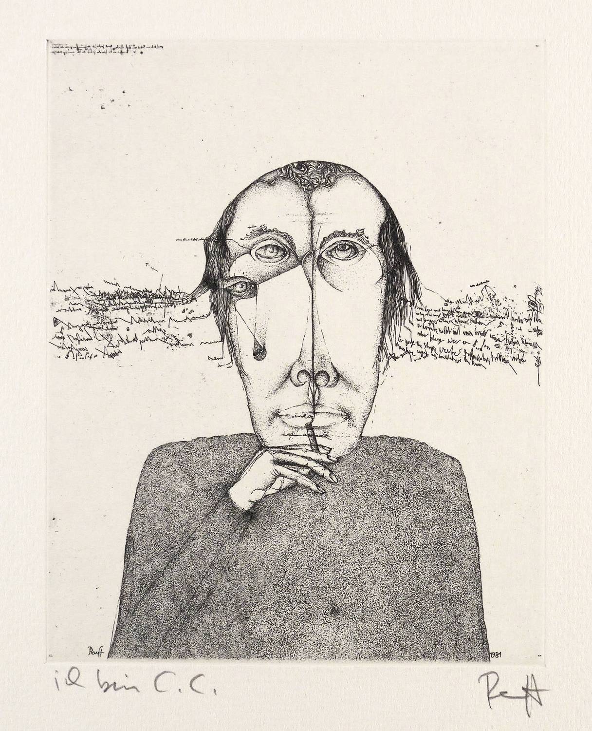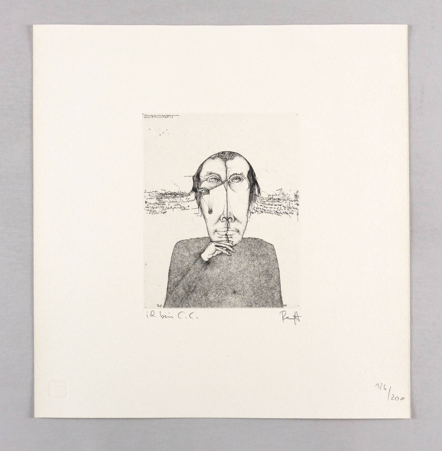 Wenke 206. Albrecht-Runge 223. – Aus: Grafikkalender 1982 (I) (Berlin: Staatlicher Kunsthandel der DDR 1981). – Rechts unten in Bleistift signiert: ″Ranft″. Links Titel: ″ich bin C.C.″ In der Blattecke rechts unten Auflagenbezeichnung. Trockenstempel der Grafik Edition. In der Platte links unten signiert und rechts datiert. Dazu diverse Inschriften. – Tadelloses Exemplar. Sehr guter Zustand.