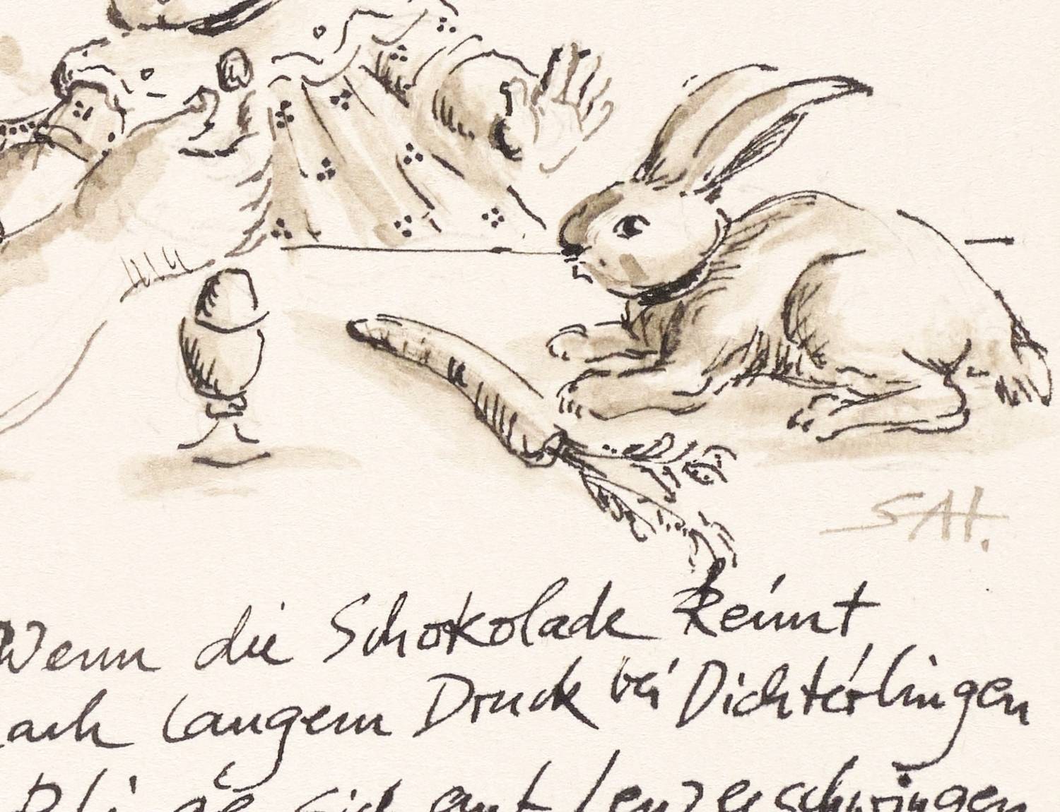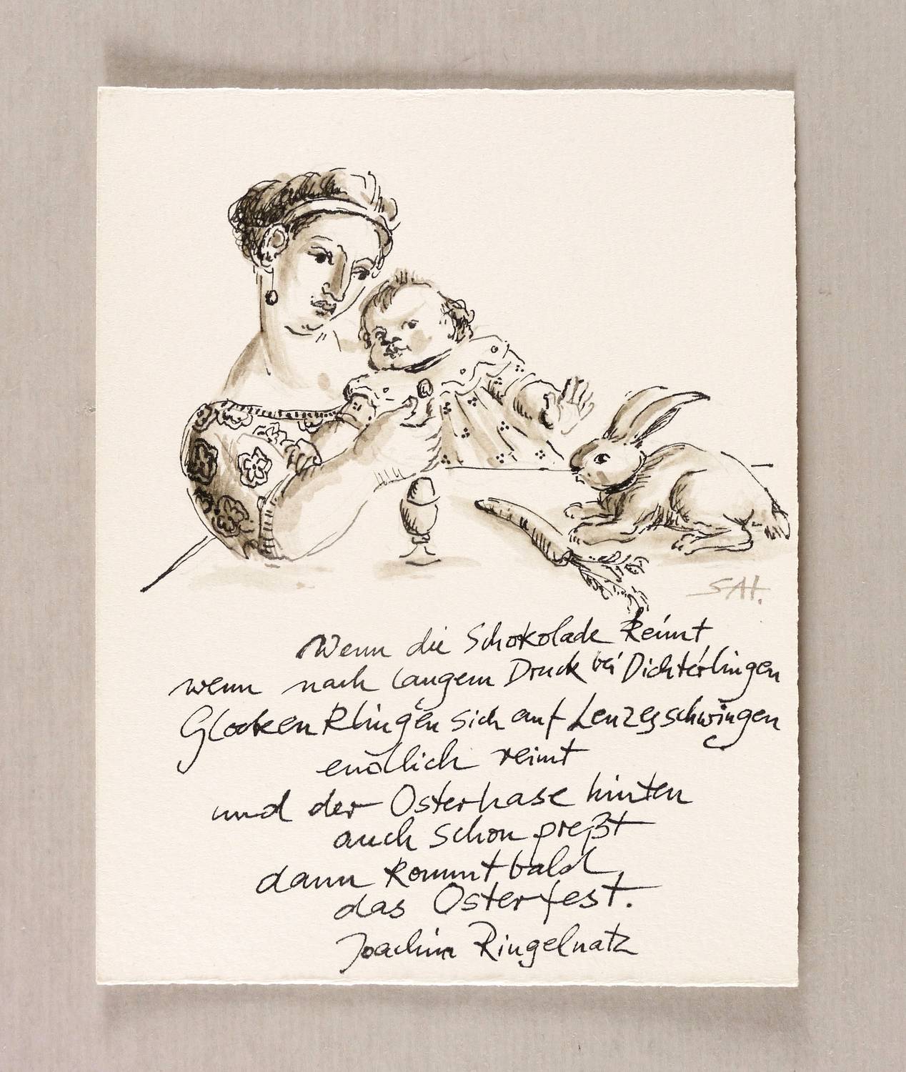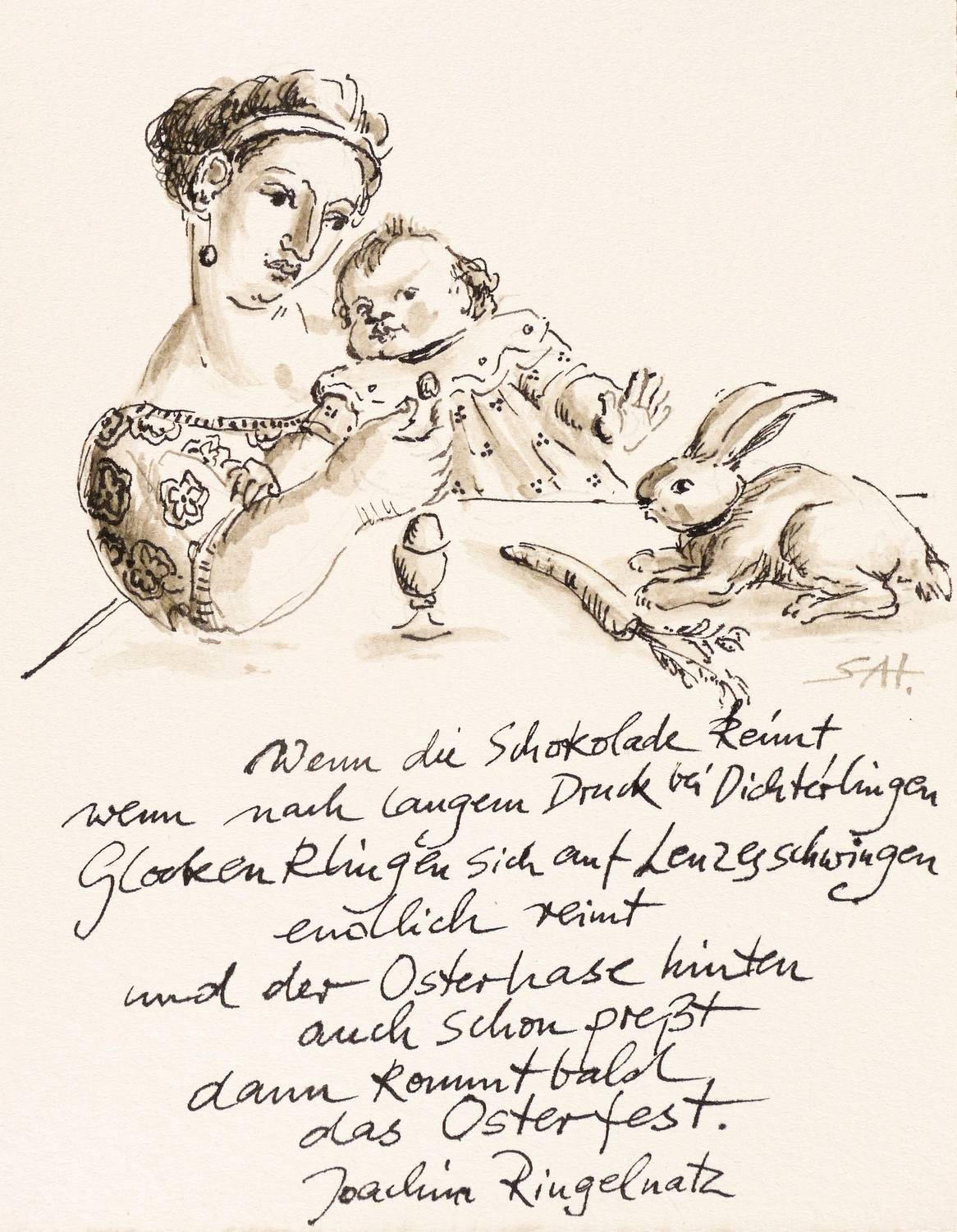 Rechts unten in Tusche signiert mit Monogramm: ″SAH″. Unterhalb Inschrift: ″Wenn die Schokolade keimt, / wenn nach langem Druck bei Dichterlingen / Glockenklingen sich auf Lenzesschwingen / endlich reimt / und der Osterhase hinten / auch schon preßt / dann kommt bald / das Osterfest. / Joachim Ringelnatz.″ – Tadelloses Exemplar.