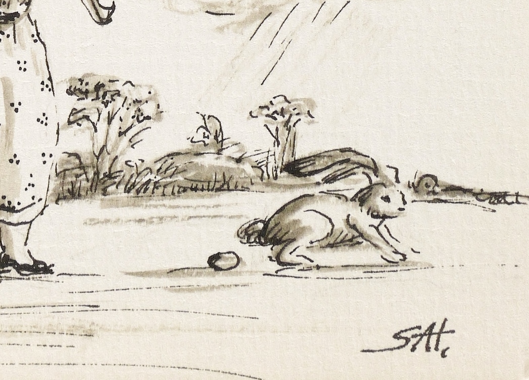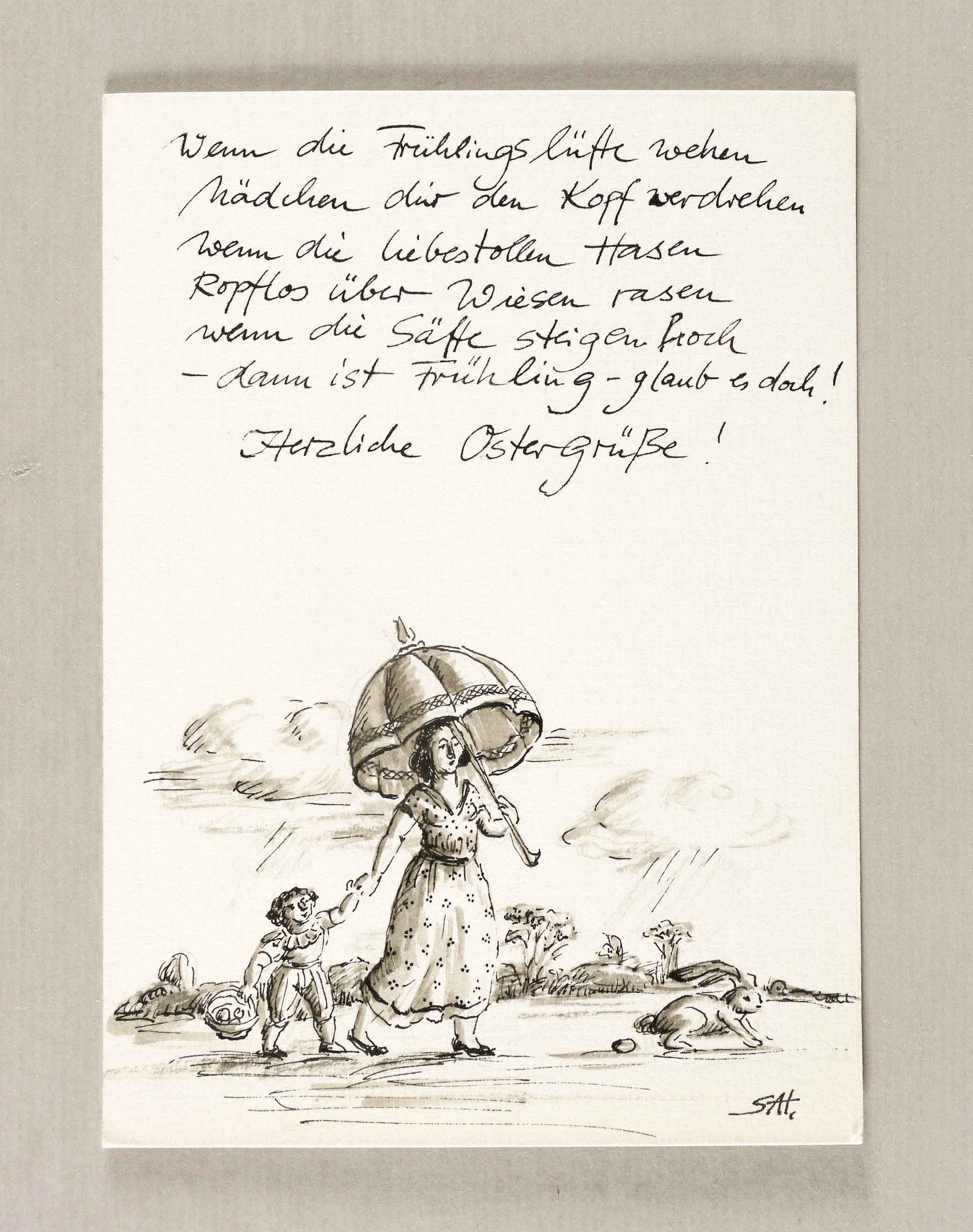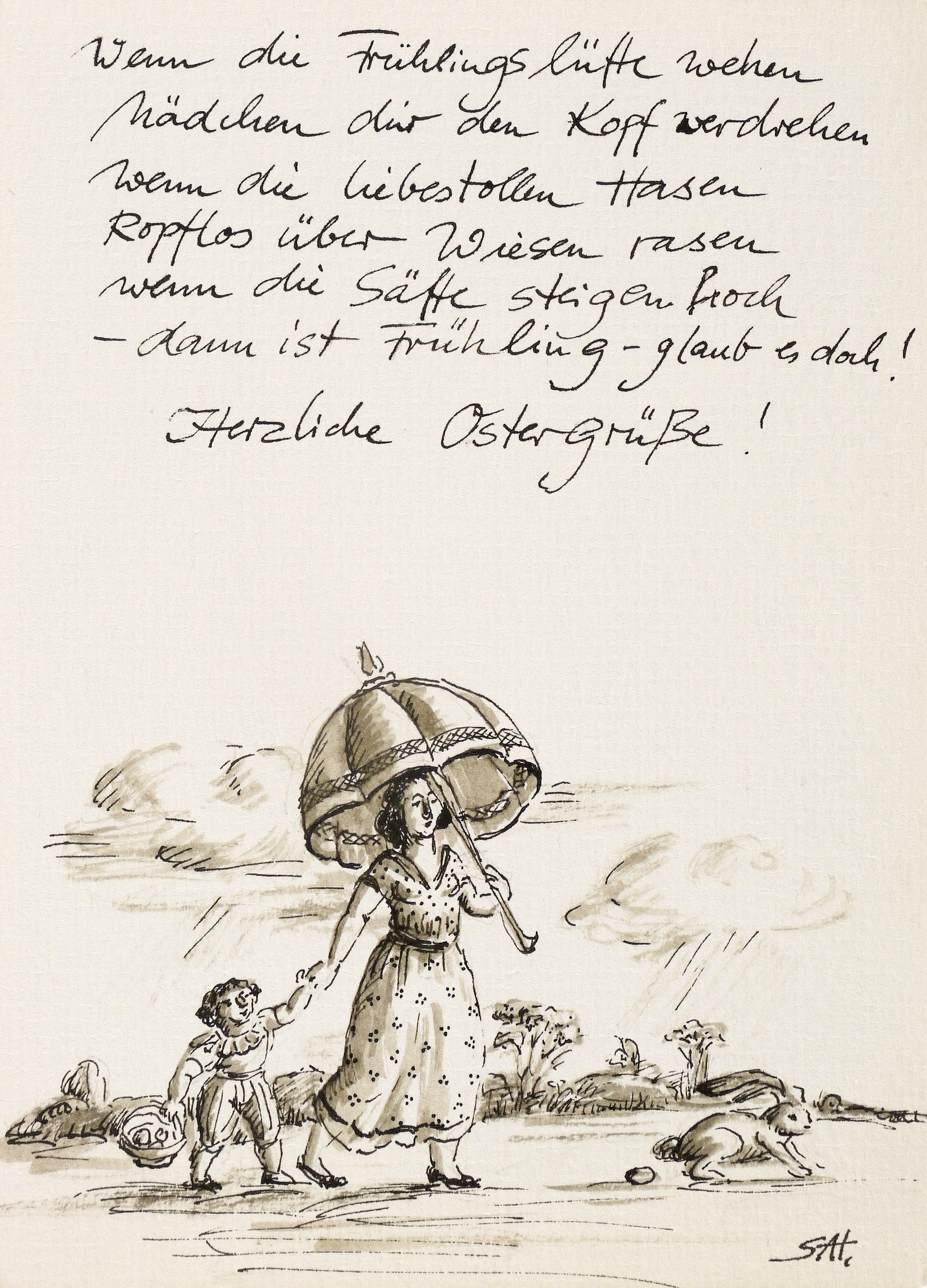Rechts unten in Tusche signiert mit Monogramm: ″SAH″. Oberhalb Inschrift: ″Wenn die Frühlingslüfte wehen / Mädchen dir den Kopf verdrehen / wenn die liebestollen Hasen / kopflos über Wiesen rasen / wenn die Säfte steigen hoch / - dann ist Frühling - glaub es doch ! / Herzliche Ostergrüße!″ – Tadelloses Exemplar.