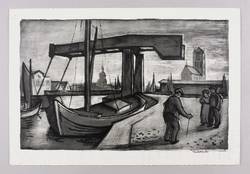 1958. Farblithografie / Kreidelithografie, in Grau & Schwarz, auf rauem hellgelbem Bütten. – Originale Künstlergrafik, von Herbert Tucholski. – 30,7 x 48,6 cm (Darstellung / Druckbild), 37 x 54 cm (Blatt).
