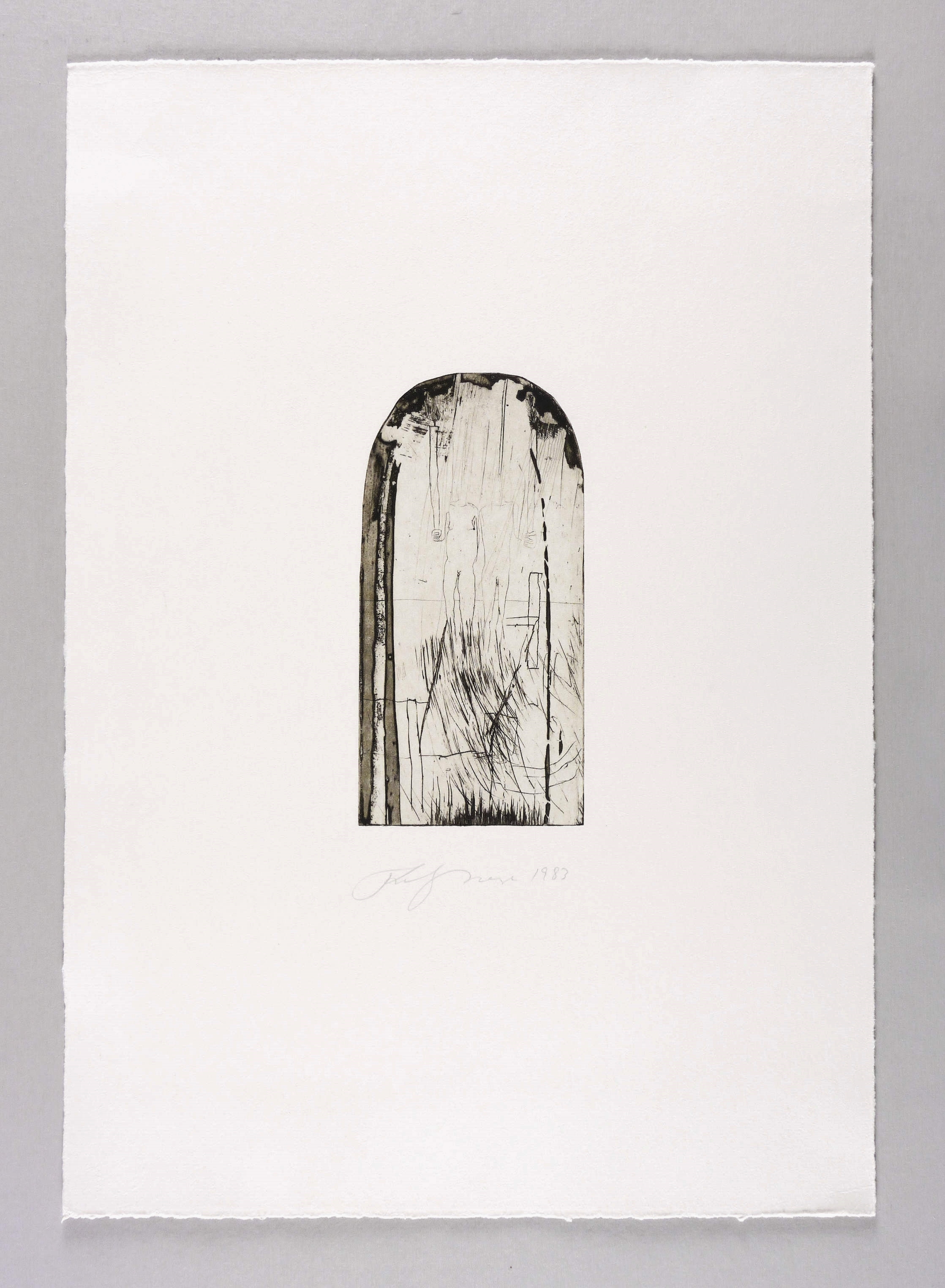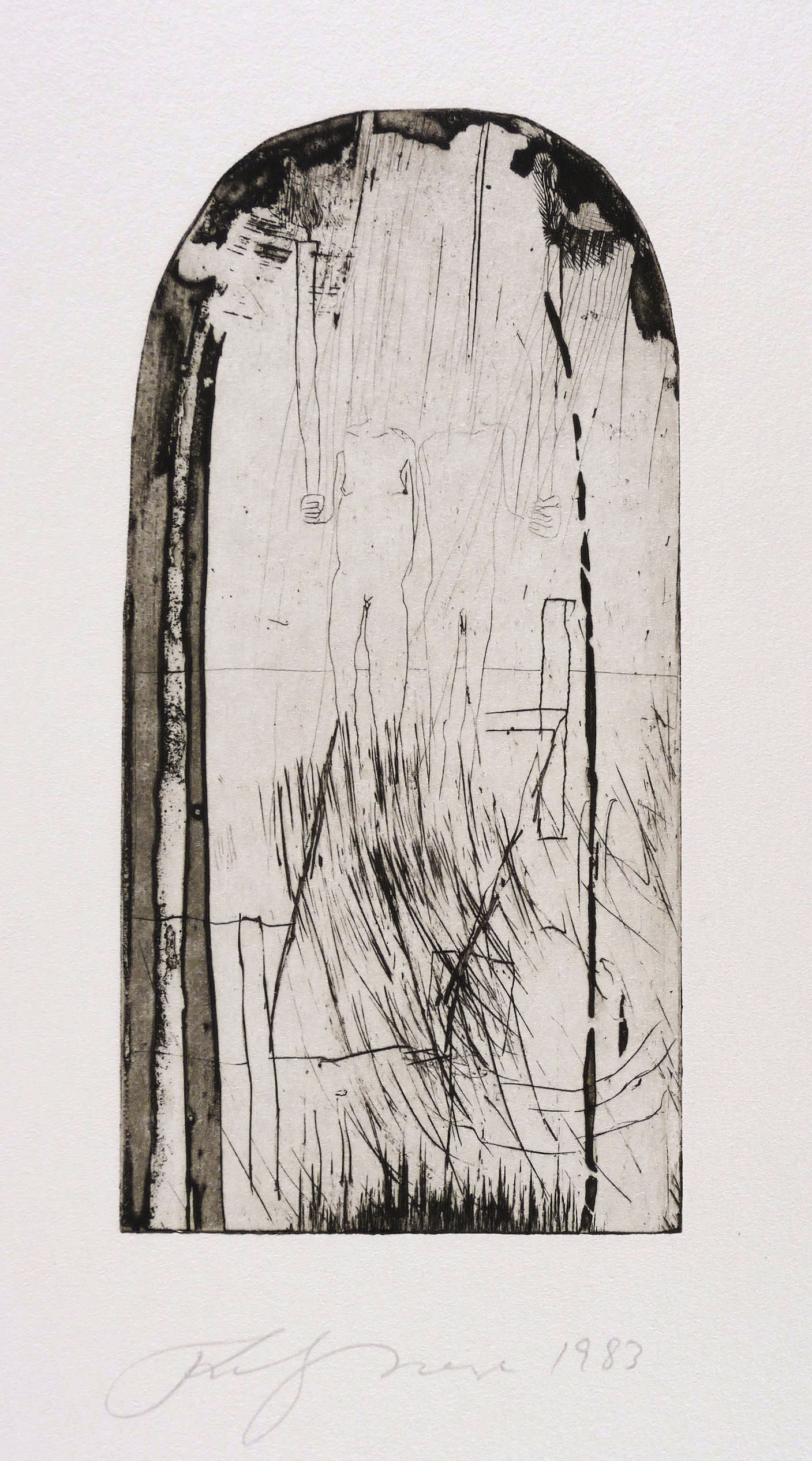1983. Radierung / Strichätzung, in Schwarz, auf festem hellchamois Velinkarton. – Originale Künstlergrafik, von Felix Droese. – 21,2 x 10,6 cm (Darstellung / Platte), 54 x 38 cm (Blatt).