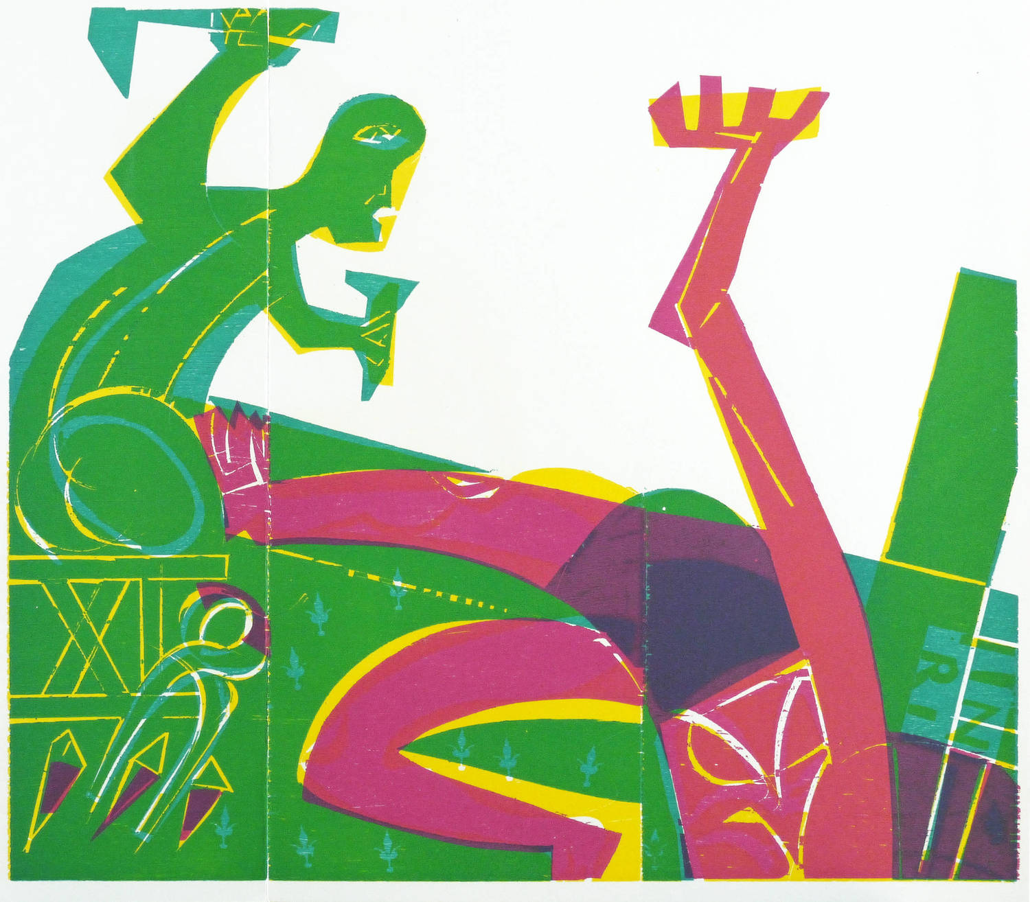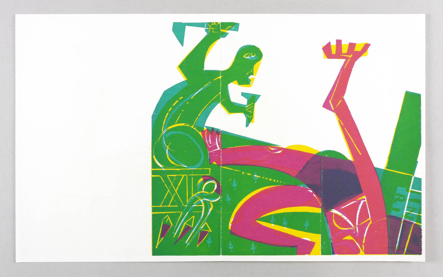 1967. Farbholzschnitt, in 4 Farben, auf hellchamois Werkdruck. – Originale Künstlergrafik, von HAP Grieshaber. – Auflage 3000 Exemplare. – 38 x 62 cm (Doppelblatt), 35,2 x 40,6 cm (Darstellung / Druckbild).