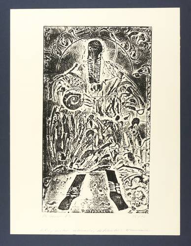 1973. Farbradierung / Materialdruck & Aquatinta, in Schwarz, auf hartem Maschinenpapier. – Originale Künstlergrafik, von Philip Oeser. – Auflage Exemplar Nr. 35/40. – 39,6 x 22,8 cm (Darstellung / Platte), 48 x 36 cm (Blatt).
