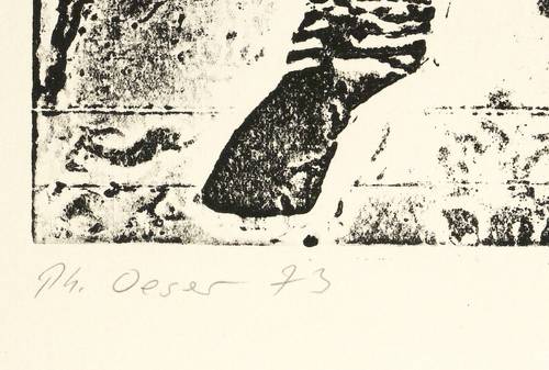 Philip Oeser (*1929 Nordhausen - 2013 Weimar). Eigentlich Helmut Müller. Deutscher Maler und Grafiker. 1948 Malschule von Martin Domke. Ab 1949 Studium an der Staatlichen Hochschule für Baukunst und bildende Künste Weimar. Ab 1951 Studium an der Hochschule für Bildende Künste Berlin-Charlottenburg bei Hans Uhlmann und Max Kaus unter dem Rektorat von Carl Hofer. 1956 Meisterschüler bei Max Kaus. 1957 Beginn freischaffender Tätigkeit in West-Berlin. 1959 Rückkehr nach Nordhausen. Seit 1961 Gemälderestaurator am Angermuseum Erfurt, seit 1964 Hauptrestaurator an den Staatlichen Kunstsammlungen Weimar. 1965 Annahme des Pseudonyms Philip Oeser. 1972 Kunstpreis der Stadt Weimar für Restaurierungsarbeiten an Cranach-Gemälden. 1974 Ernennung zum Chefrestaurator der Kunstsammlungen zu Weimar. 1977 Beginn der freiberuflichen Tätigkeit. 1990 Gründungsmitglied der Gruppe 'D 206. Die Thüringer Sezession'.