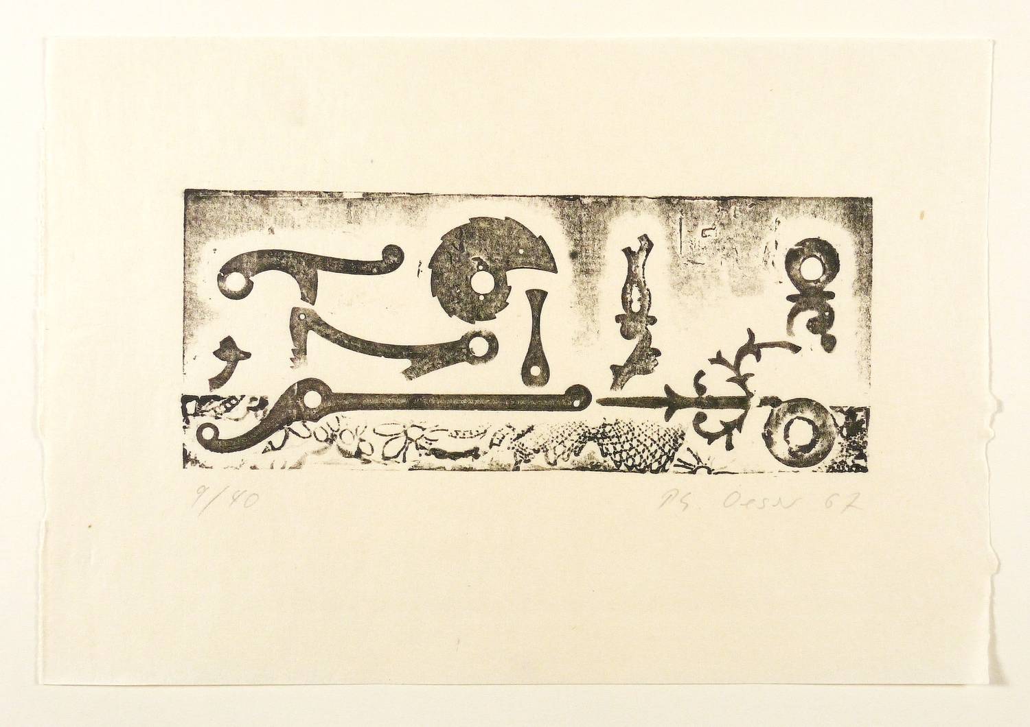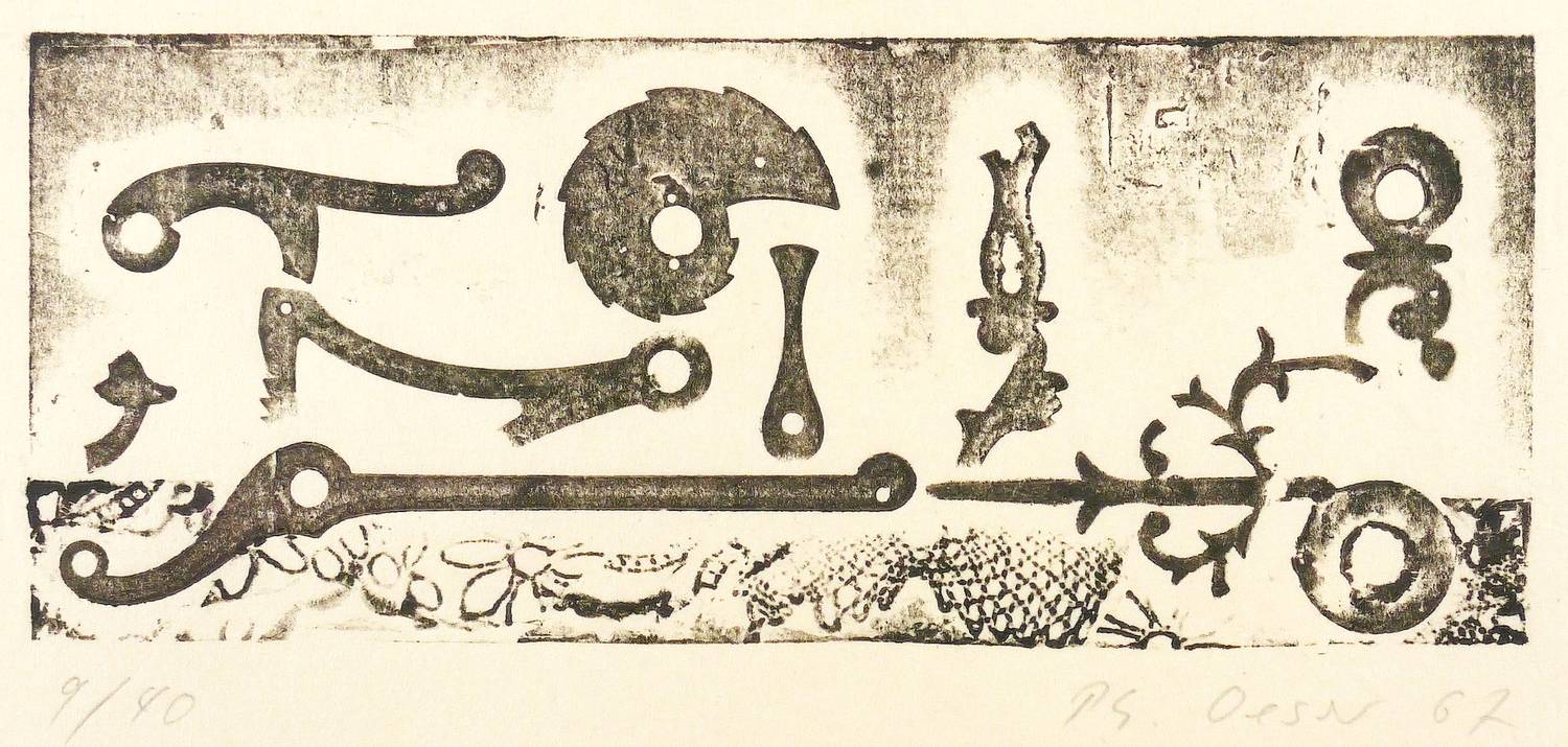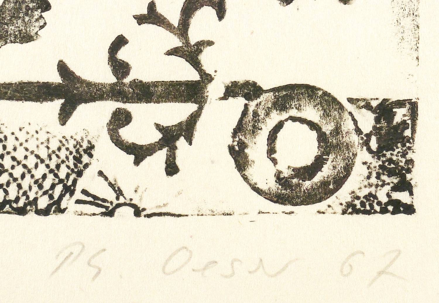 1967. Materialdruck, in Schwarz, auf feinem Papier. – Originale Künstlergrafik, von Philip Oeser. – Auflage Exemplar Nr. 9/40. – 9,1 x 22,3 cm (Darstellung / Platte), 21 x 31 cm (Blatt).