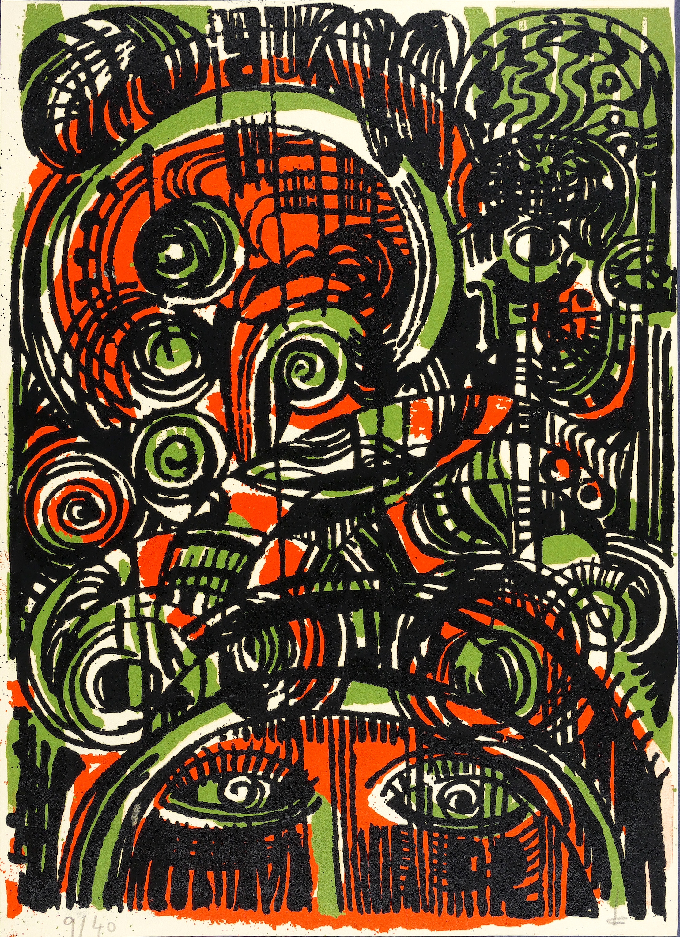1966. Farbsiebdruck / Farbserigrafie, in 3 Farben, auf hellchamois Velinkarton. – Originale Künstlergrafik, von Günther Laufer. – Auflage Exemplar Nr. 9/40. – 29,7 x 21,5 cm (Darstellung / Blatt).