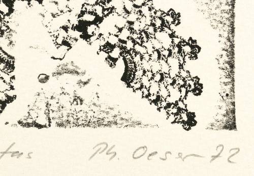 Philip Oeser (*1929 Nordhausen - 2013 Weimar). Eigentlich Helmut Müller. Deutscher Maler und Grafiker. 1948 Malschule von Martin Domke. Ab 1949 Studium an der Staatlichen Hochschule für Baukunst und bildende Künste Weimar. Ab 1951 Studium an der Hochschule für Bildende Künste Berlin-Charlottenburg bei Hans Uhlmann und Max Kaus unter dem Rektorat von Carl Hofer. 1956 Meisterschüler bei Max Kaus. 1957 Beginn freischaffender Tätigkeit in West-Berlin. 1959 Rückkehr nach Nordhausen. Seit 1961 Gemälderestaurator am Angermuseum Erfurt, seit 1964 Hauptrestaurator an den Staatlichen Kunstsammlungen Weimar. 1965 Annahme des Pseudonyms Philip Oeser. 1972 Kunstpreis der Stadt Weimar für Restaurierungsarbeiten an Cranach-Gemälden. 1974 Ernennung zum Chefrestaurator der Kunstsammlungen zu Weimar. 1977 Beginn der freiberuflichen Tätigkeit. 1990 Gründungsmitglied der Gruppe 'D 206. Die Thüringer Sezession'.