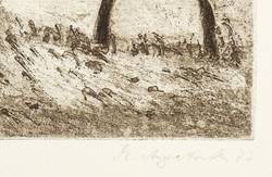 1977. Radierung / Vernis mou, in Schwarzbraun, auf hellgelbem Velin. – Originale Künstlergrafik, von Michael Augustinski. – Auflage Exemplar Nr. 1/22. – 18,1 x 24,5 cm (Darstellung / Platte), 25 x 33 cm (Blatt).