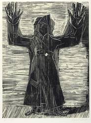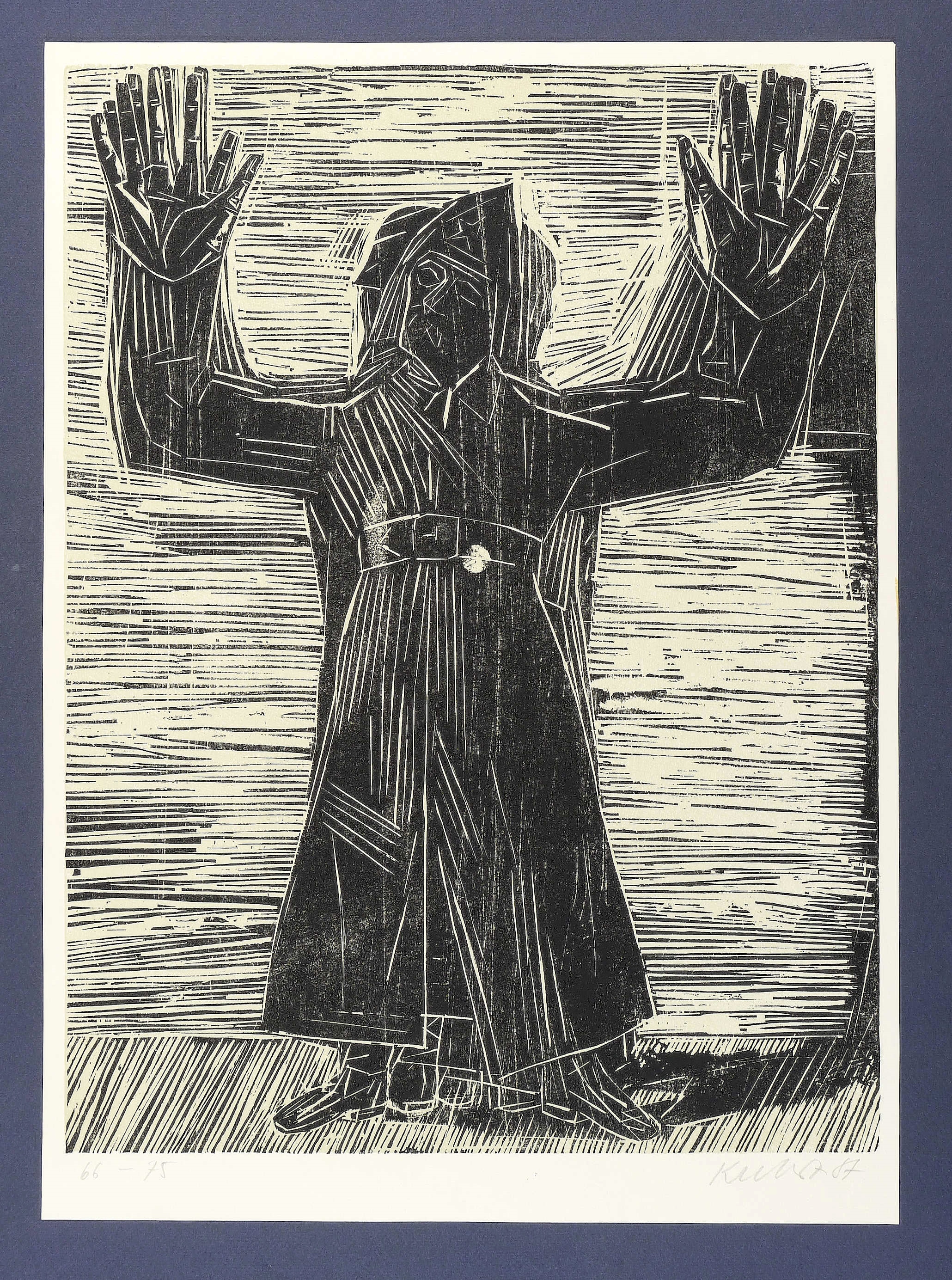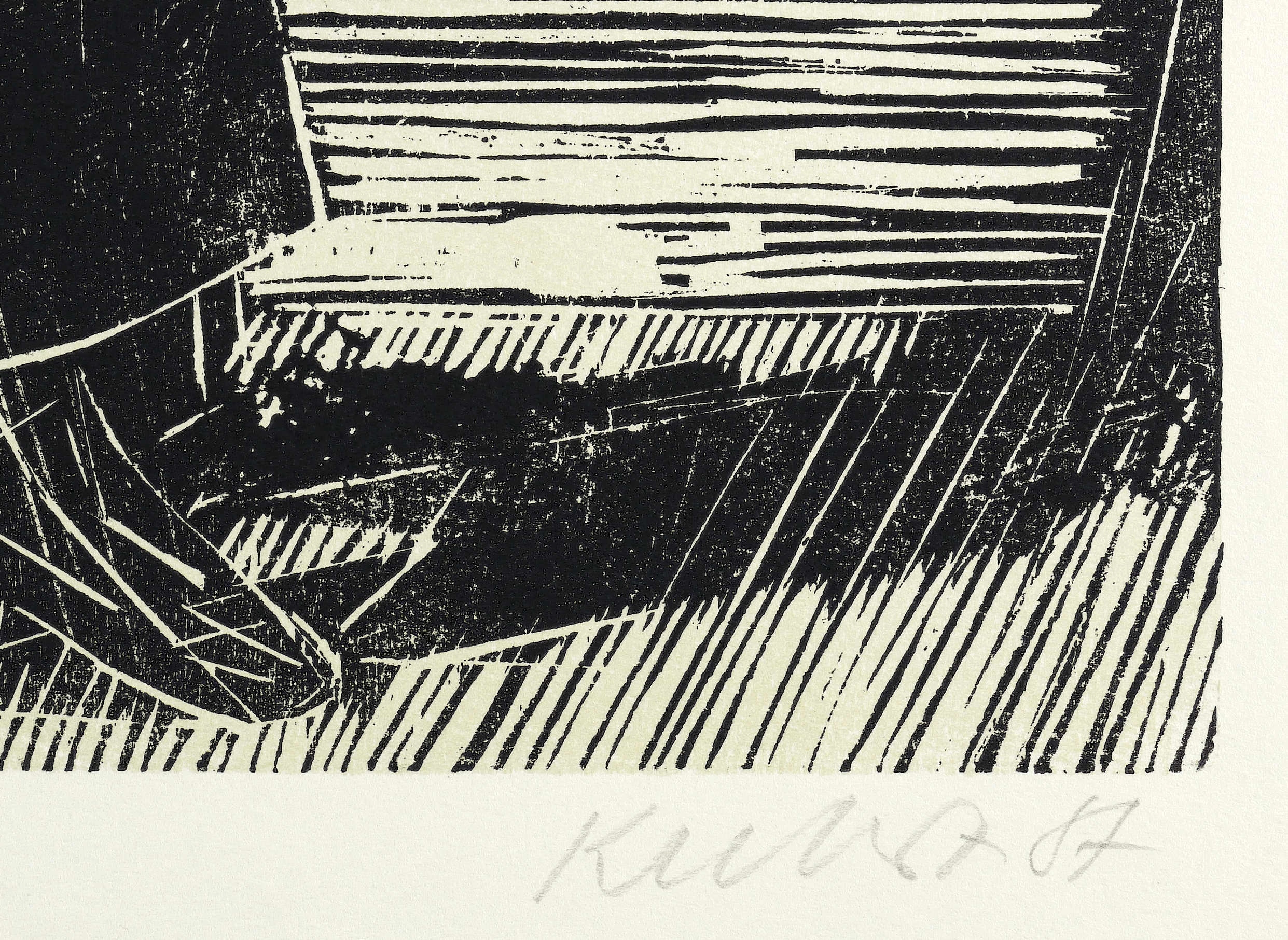 1987. Holzschnitt, in Schwarz, über sandfarbener Tonplatte, auf Karton. – Von Rolf Kuhrt. – Auflage Exemplar Nr. 66/75. – 47,8 x 35,7 cm (Darstellung / Druckbild), 52 x 37,5 cm (Blatt).