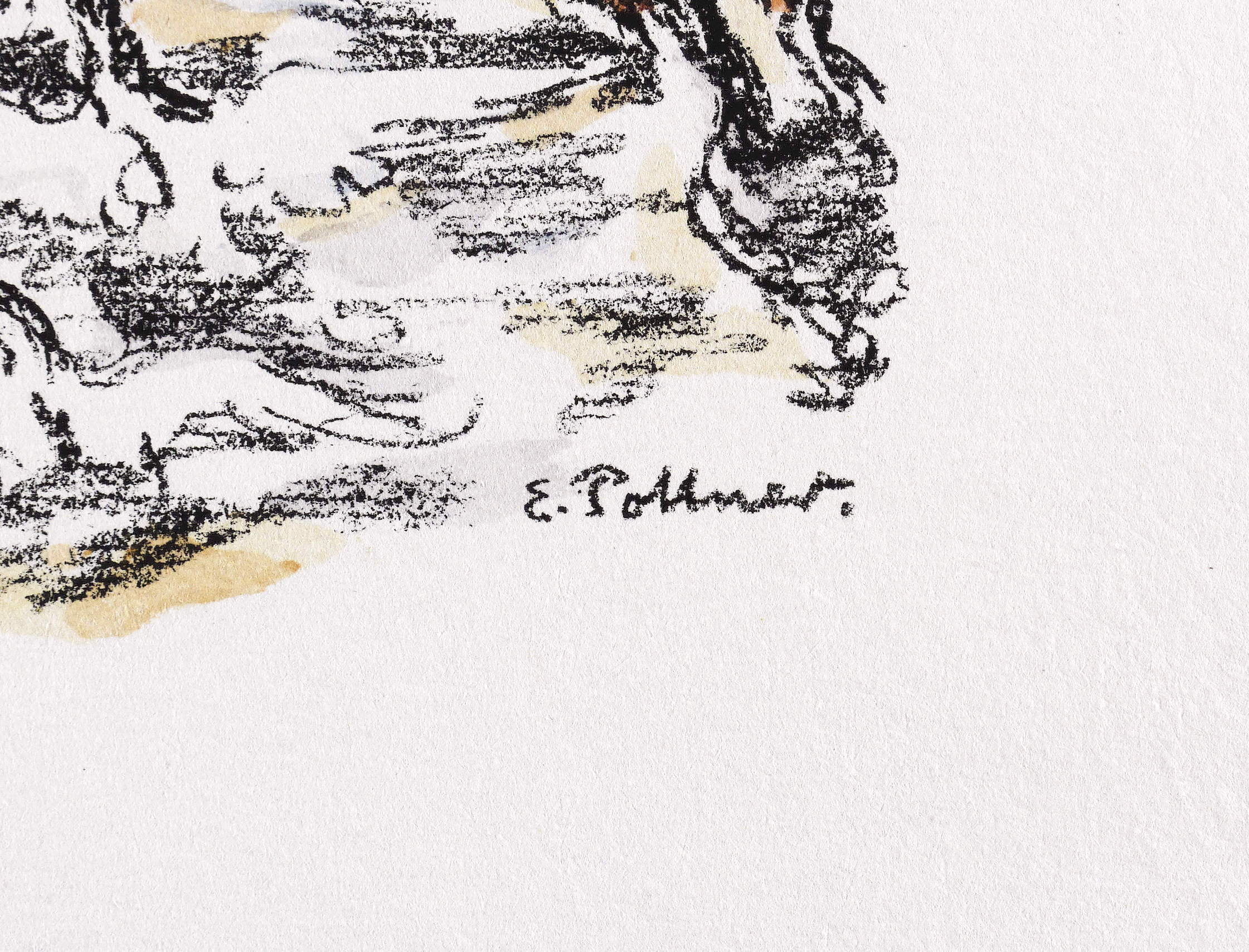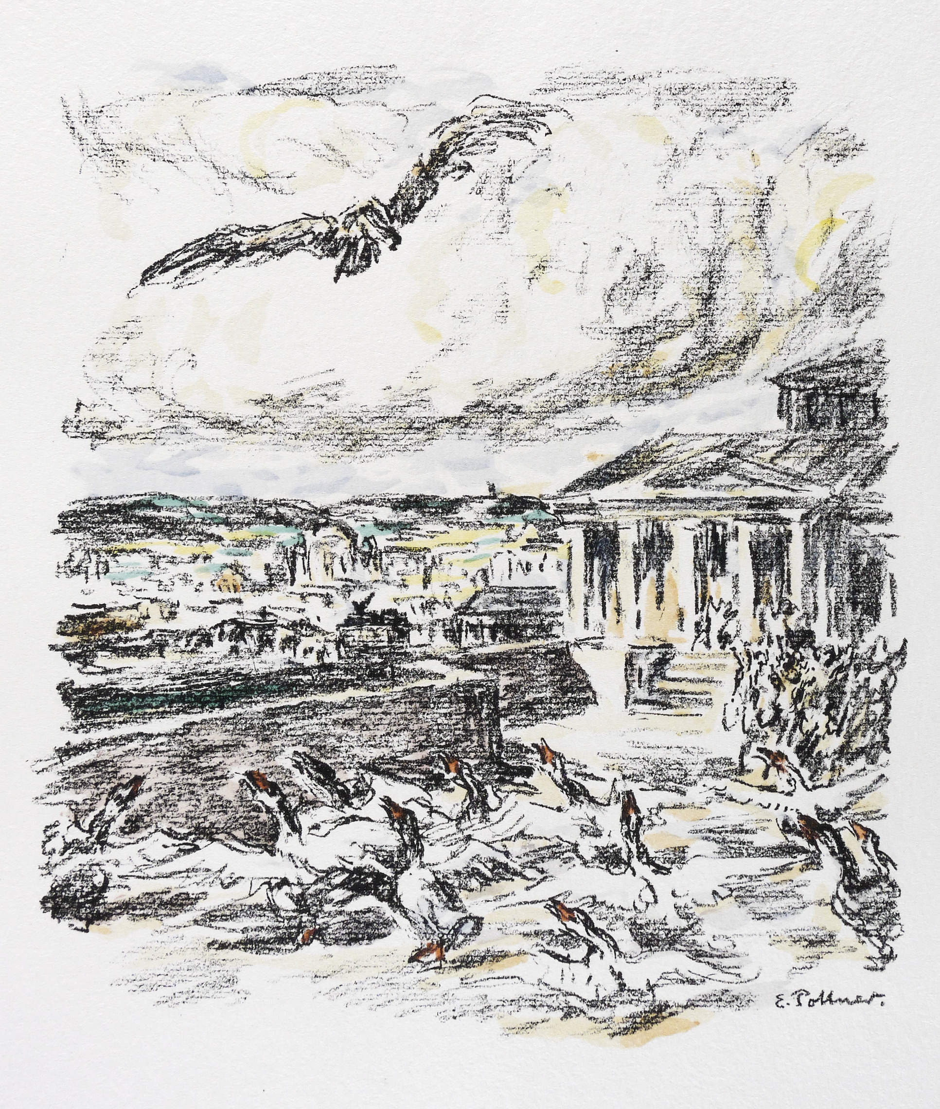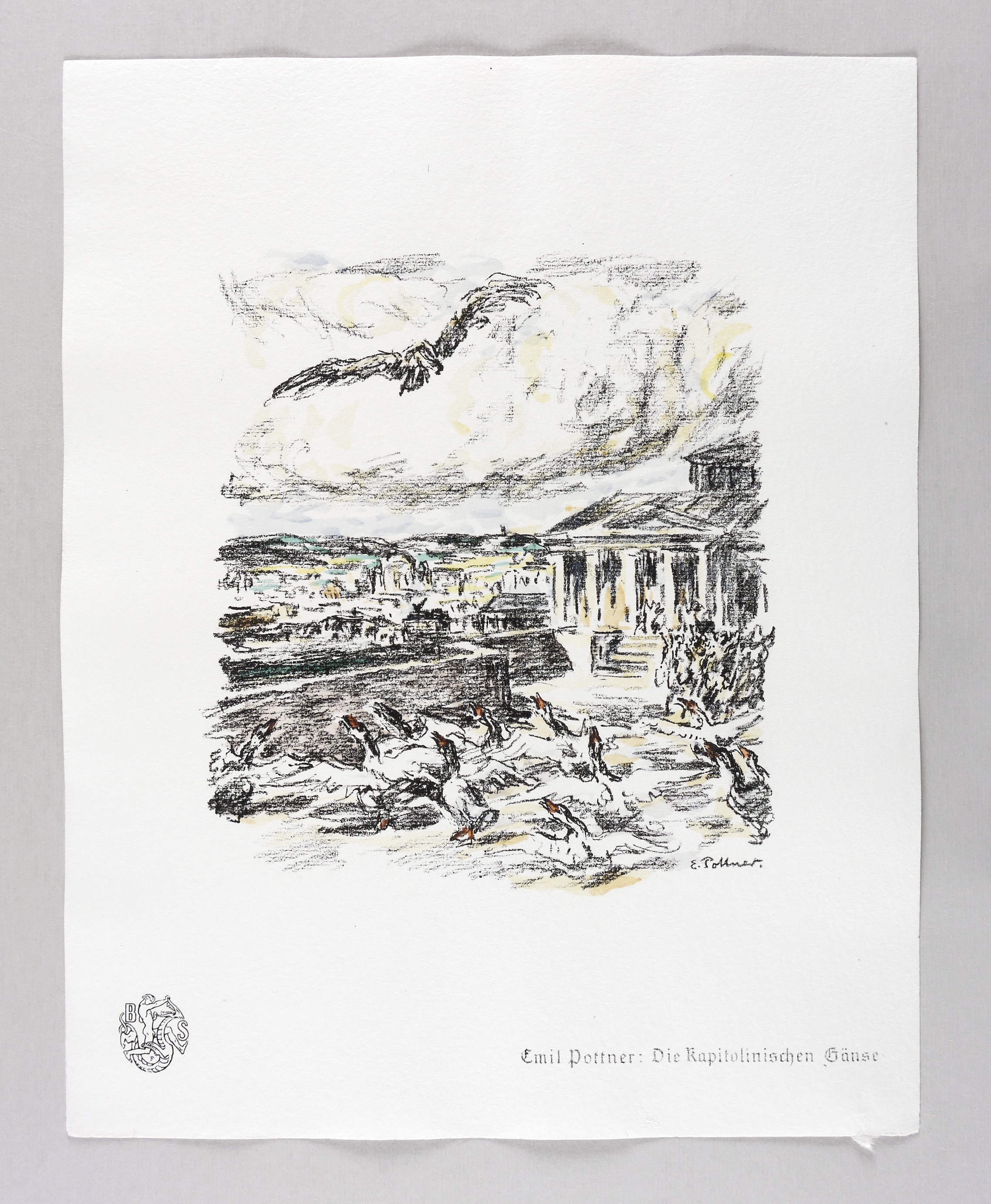 Aus: Krieg und Kunst. Original-Steinzeichnungen der Berliner Sezession (Berlin: Julius Bard 1915-1918). – Nicht handsigniert. Im Stein signiert rechts unten: ″E. Pottner″. Außerhalb des Steins typografisch bezeichnet rechts unten: ″Emil Pottner: Die Kapitolinischen Gänse″. Links unten Signet der Berliner Secession. – Originalrandiges Exemplar. Sehr guter Zustand.