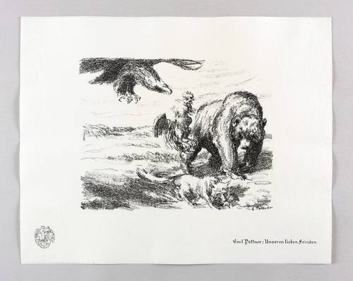 Aus: Krieg und Kunst. Original-Steinzeichnungen der Berliner Sezession (Berlin: Julius Bard 1915). – Nicht handsigniert. Im Stein rechts unten signiert: ″E. Pottner″. Im Blattrand rechts unten typografisch bezeichnet: ″Emil Pottner: Unseren lieben Feinden″. Links Signet der Berliner Secession. – Sehr guter Zustand.