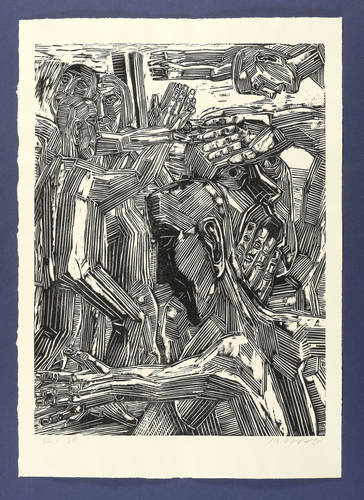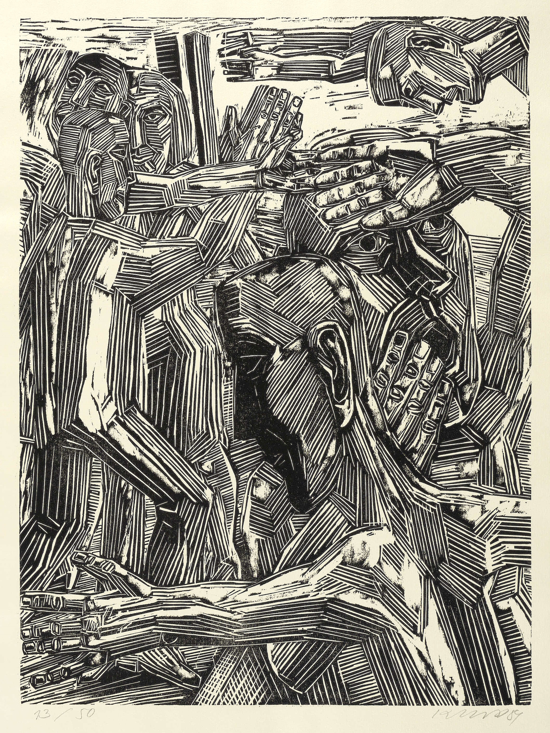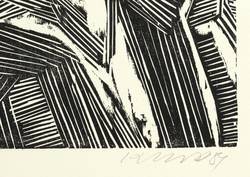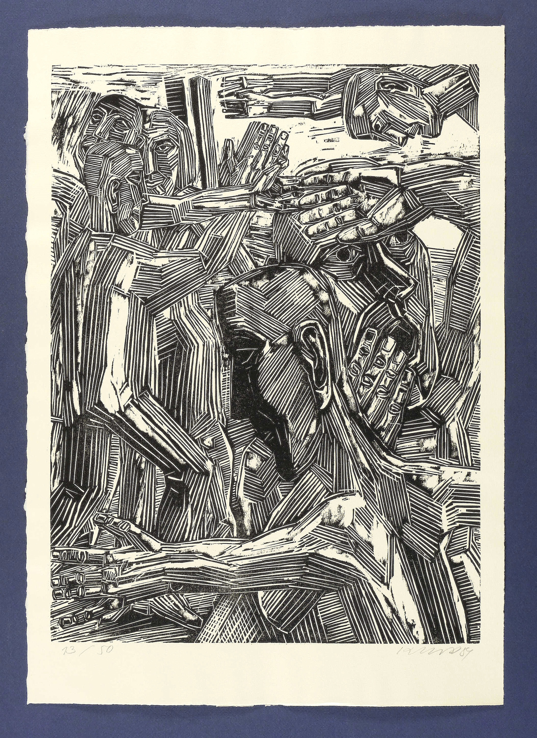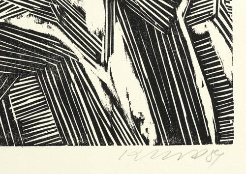 1984. Holzschnitt, in Schwarz, auf gelbem Büttenkarton. – Originale Künstlergrafik, von Rolf Kuhrt. – Auflage Exemplar Nr. 13/50. – 47,5 x 35,3 cm (Darstellung), 55,5 x 39,5 cm (Blatt).