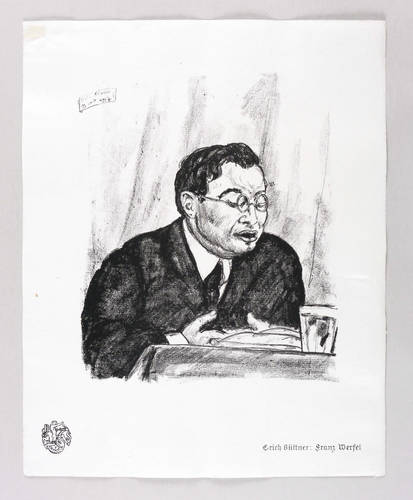 Aus: Krieg und Kunst. Original-Steinzeichnungen der Berliner Sezession (Berlin: Julius Bard 1917). – Nicht handsigniert. Im Stein links oben im Schriftband signiert und datiert: ″Erich Büttner 1917″. Außerhalb des Steins rechts unten typografisch bezeichnet und betitelt: ″Erich Büttner: Franz Werfel″. Links unten Vignette der Berliner Sezession. – Originalrandiges Exemplar. Linke obere Blattecke mit leicht durchschlagendem älterem Montagerest. Guter Zustand.
