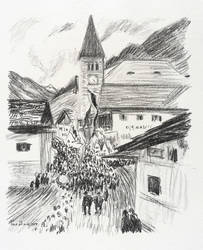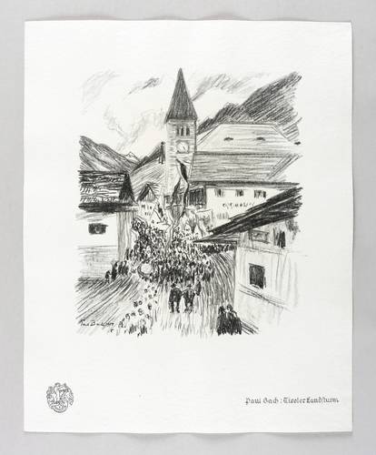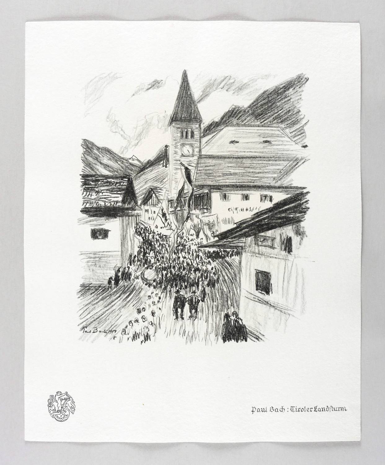 Aus: Krieg und Kunst. Original-Steinzeichnungen der Berliner Sezession (Berlin: Julius Bard 1915). – Nicht handsigniert. Im Stein links unten signiert und datiert: ″Paul Bach 1914″. Im Blattrand rechts unten typografisch bezeichnet: ″Paul Bach: Tiroler Landsturm″. Links Signet der Berliner Secession. – Tadellos. Sehr guter Zustand.