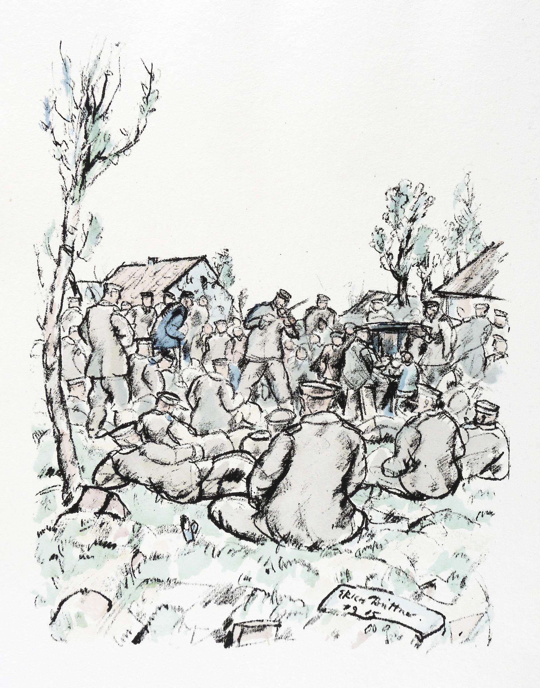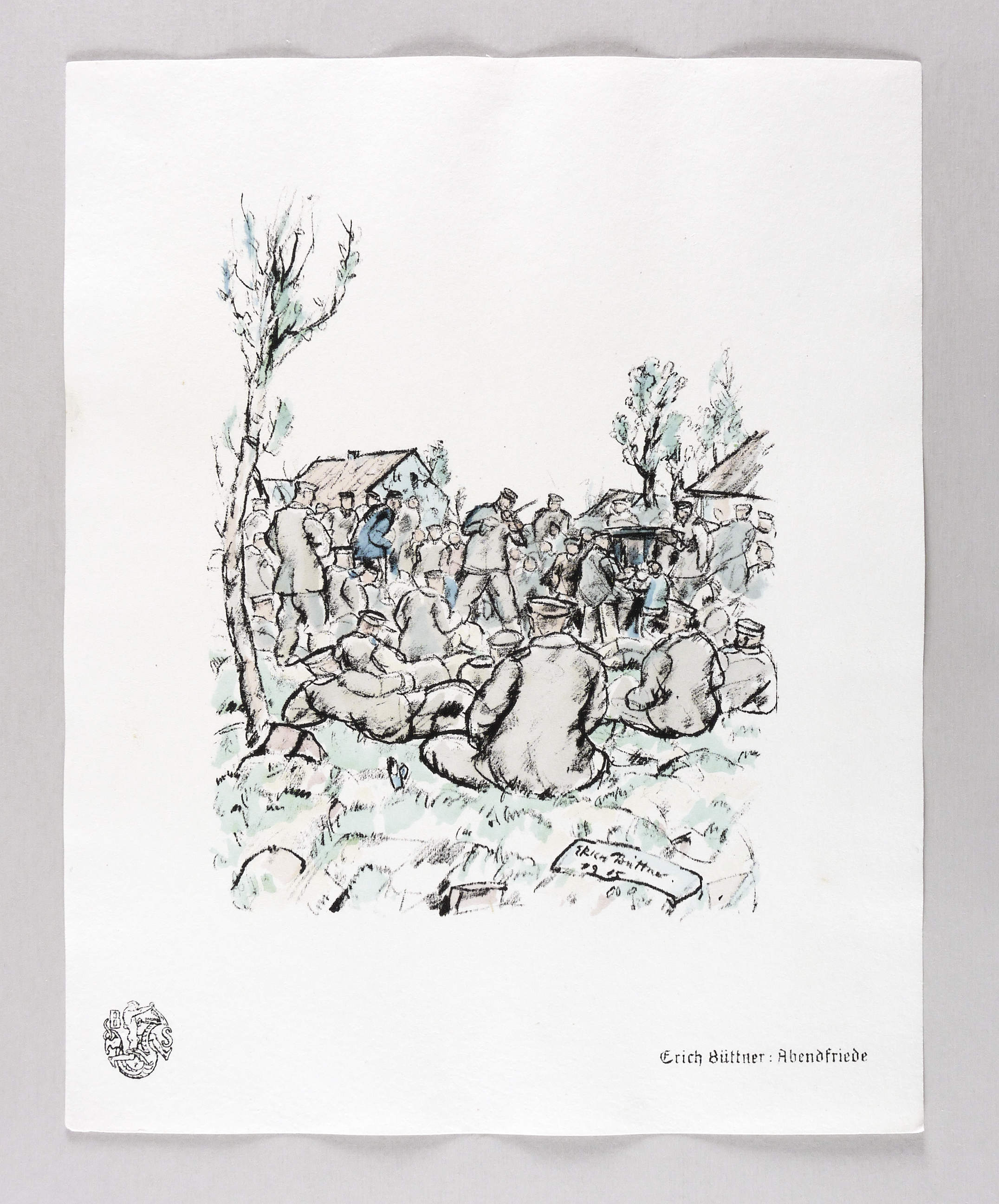 Aus: Krieg und Kunst. Original-Steinzeichnungen der Berliner Sezession (Berlin: Julius Bard 1915). – Nicht handsigniert. Im Stein rechts unten signiert und datiert im Schriftband: ″Erich Büttner 1915″. Außerhalb des Steins rechts unten typografisch bezeichnet und betitelt: ″Erich Büttner: Abendfriede″. Links unten Vignette der Berliner Sezession. – Originalrandiges Exemplar. Sehr guter Zustand.