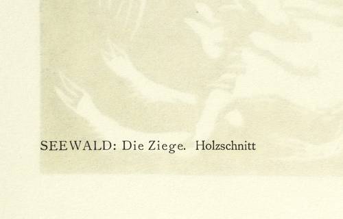 Jentsch H 81 II. Söhn HDO 108-10. – Aus: Kurt Pfister, Deutsche Graphiker der Gegenwart (Leipzig: Klinkhardt & Biermann 1920). – Nicht handsigniert. Verso typografisch bezeichnet: ″SEEWALD: Die Ziege. Holzschnitt″. Dazu in Bleistift nummeriert. – Erschienen in einer Auflage von 100 Exemplaren als originalgrafische Beilage zu ″Deutsche Graphiker der Gegenwart″ von Kurt Pfister (Blatt Nr. 17, 1920). – Sehr guter Zustand.