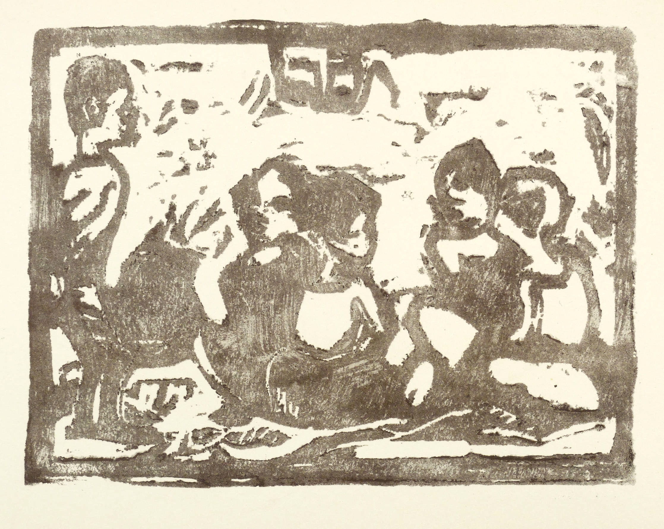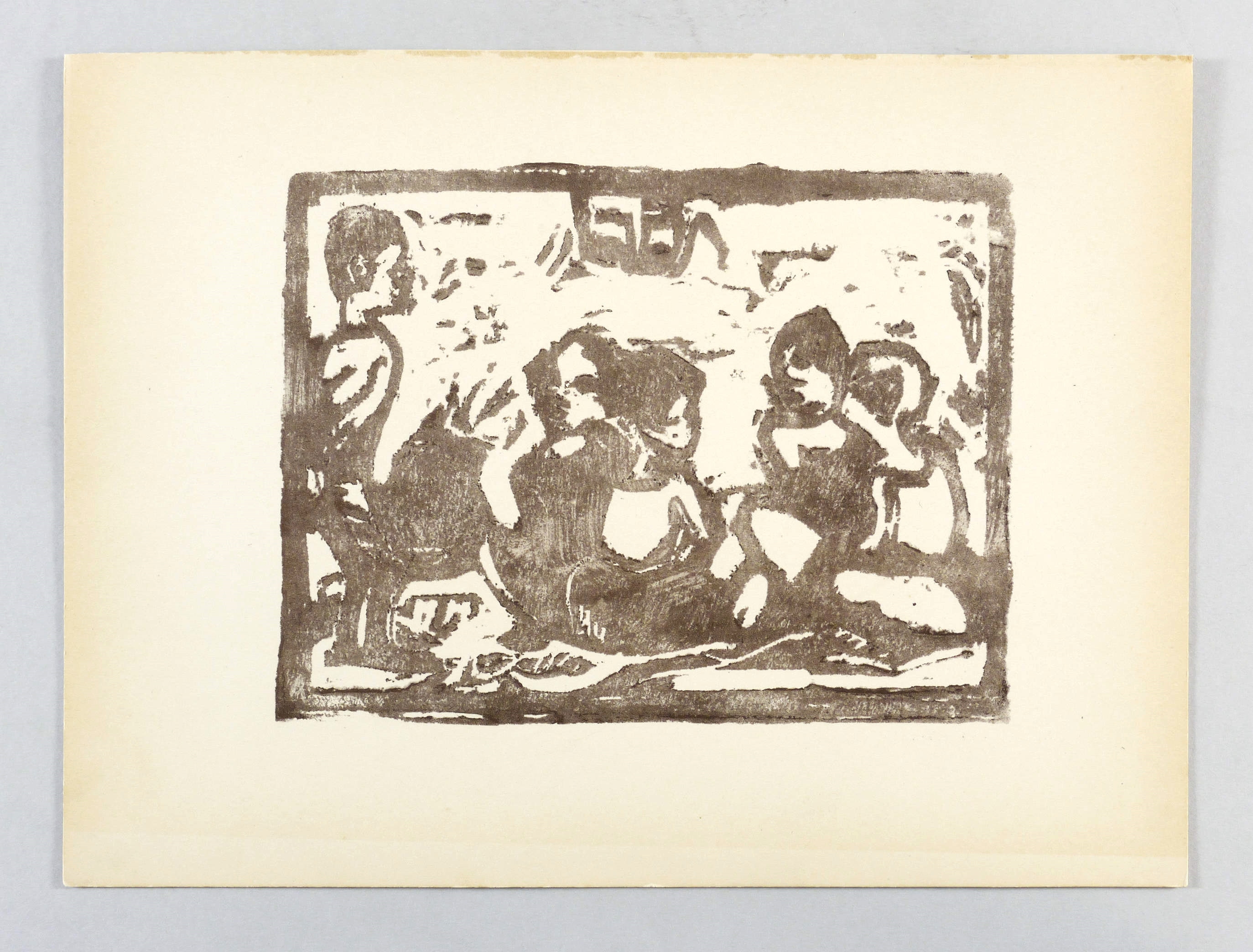 Aus: Kurt Pfister, Deutsche Graphiker der Gegenwart (Leipzig: Klinkhardt & Biermann 1920). – Nicht handsigniert. Verso typografisch bezeichnet: ″ROHLFS: Die Knaben. Holzschnitt″. Dazu in Bleistift nummeriert. – Originale und weitgehend maßhaltige Reproduktion im Gummidruck-Verfahren nach dem Holzschnitt ″Kinder″ (1915, WVZ Vogt 81). Erschienen in einer Auflage von 100 Exemplaren als originalgrafische Beilage zu ″Deutsche Graphiker der Gegenwart″ von Kurt Pfister (Blatt Nr. 15, 1920). – Im Rand leicht gegilbt. Geringe Spuren der ehemaligen Bindung. Insgesamt guter Zustand.