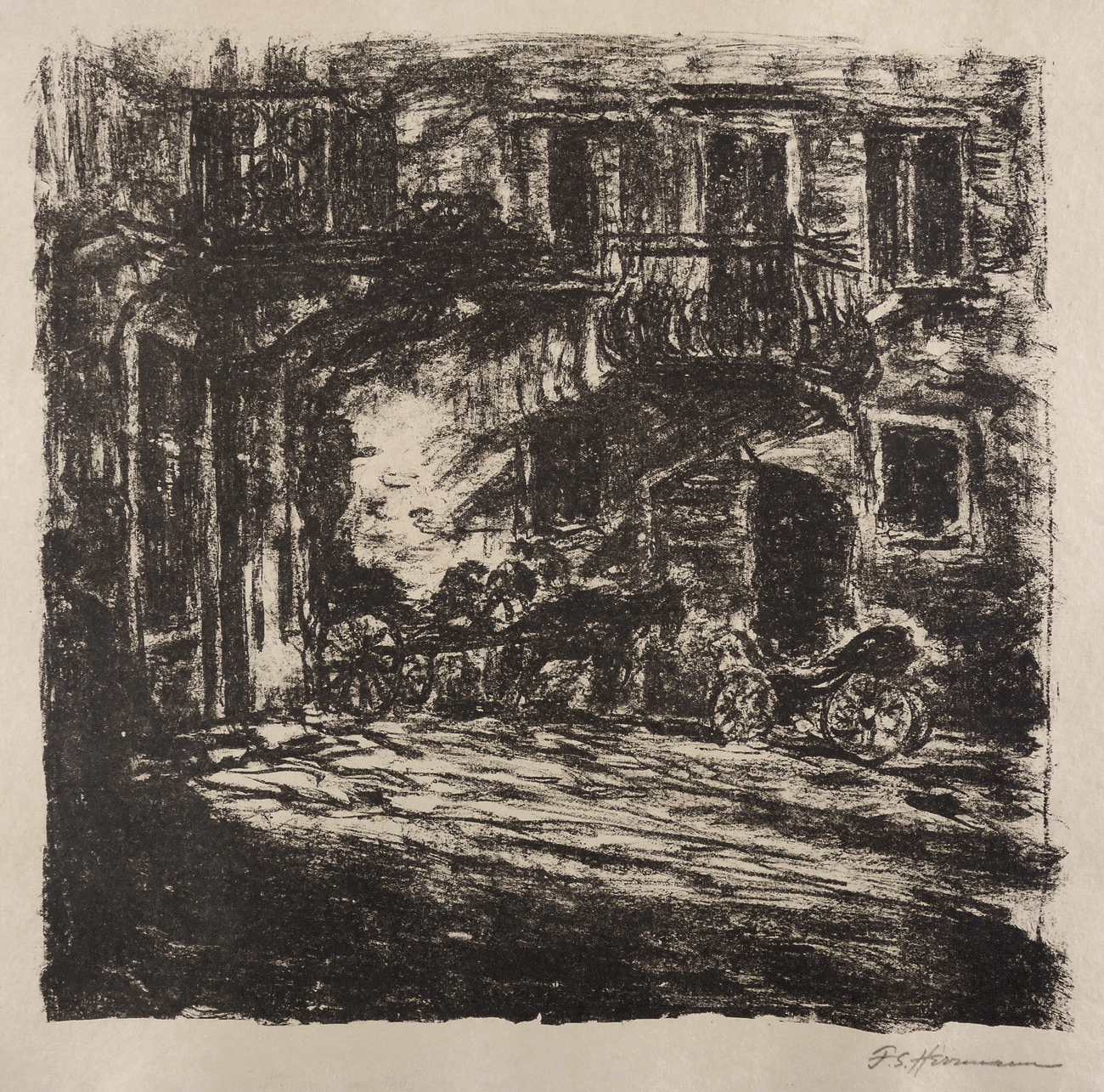Höper-Kaufmann 14 A.1. Söhn HDO 355. – Aus: Sema. 15 Originalsteinzeichnungen (München: Delphin-Verlag 1912). – Rechts unten in Bleistift signiert: ″F.S. Herrmann″. In der Blattecke links unten Signet der Künstlervereinigung Sema. Im unteren Blattrand von frmder Hand in Bleistift bezeichnet: ″Original Litho, Frank S. Herrmann, Italienischer Hof″. – Original-Lithografie aus der berühmten Grafik- Mappe der Münchner Künstlervereinigung Sema ″15 Originalsteinzeichnungen″ (München: Delphin-Verlag 1912), eine der ersten modernen Grafik-Editionen und Mappenwerke. Noch vor dem Blauen Reiter schlossen sich 1911 u.a. Paul Klee, Max Oppenheimer, Alfred Kubin und Egon Schiele zur Vereinigung der Sema (von griechisch ″Zeichen″) zusammen und publizierten 1912 diese Mappe. – Leichte Randmängel. Blattkanten etwas angestaubt. Mäßig guter Zustand.