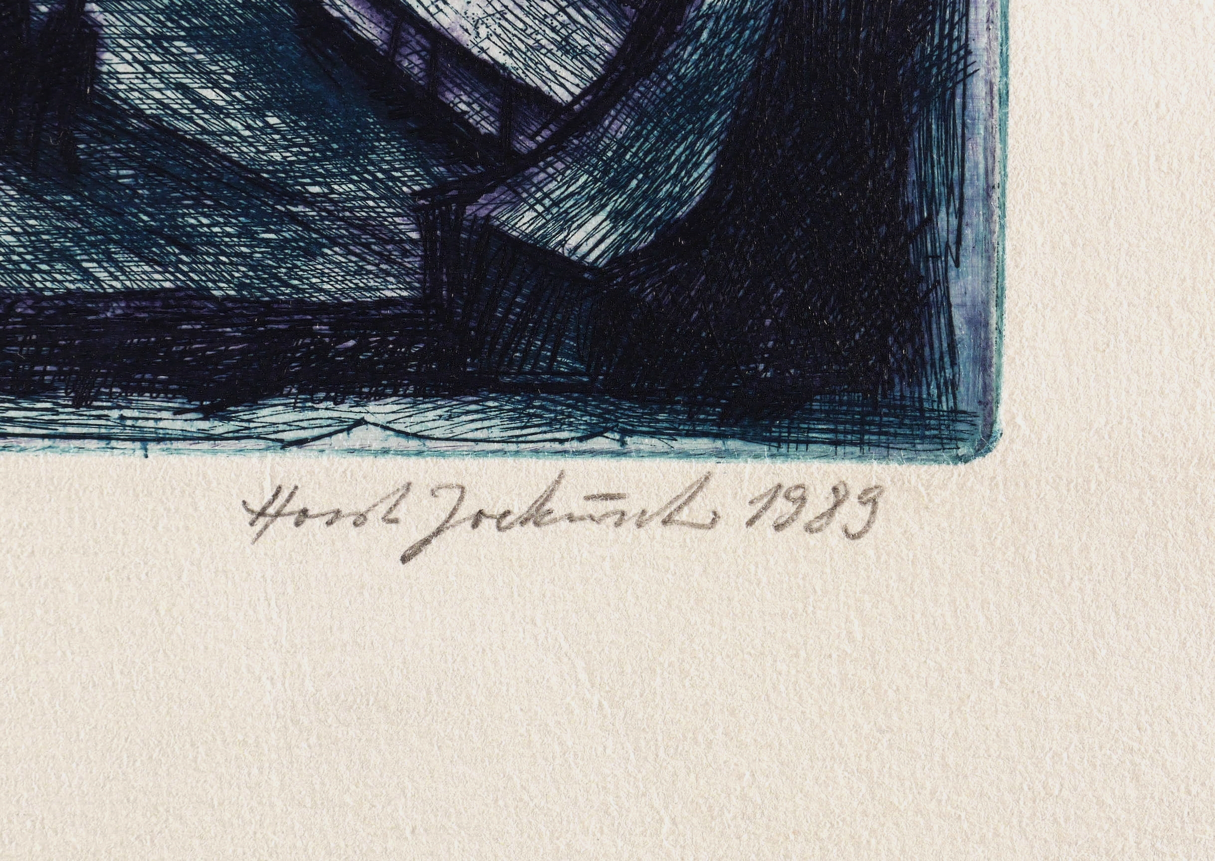 1989. Farbradierung / Strichätzung & Kaltnadel, in Blaugrün & Schwarz, auf schwerem hellchamois Velin. – Originale Künstlergrafik, von Horst Jockusch. – Auflage Exemplar Nr. 5/50. – 42,5 x 33,7 cm (Darstellung / Platte), 54 x 40 cm (Blatt).