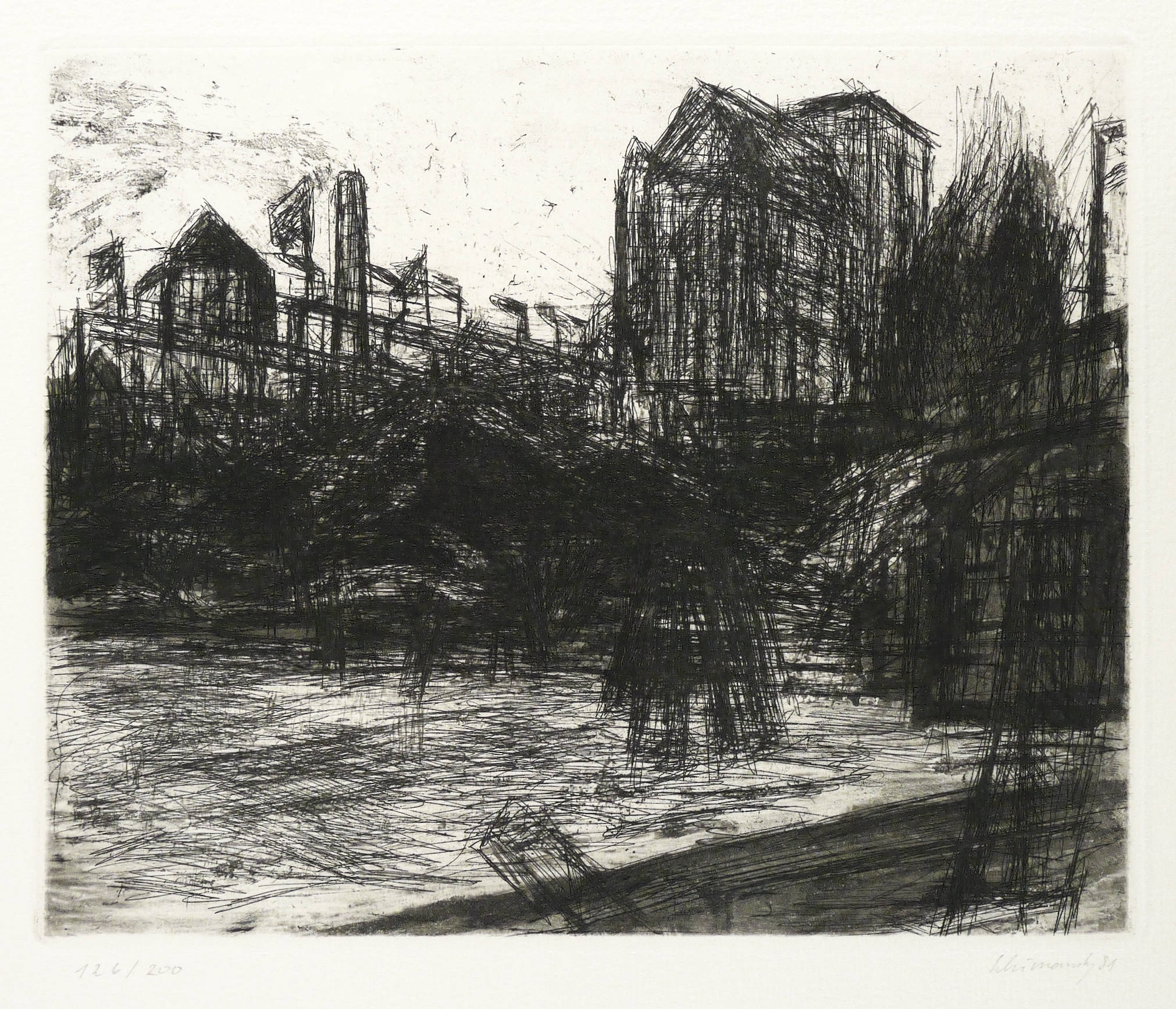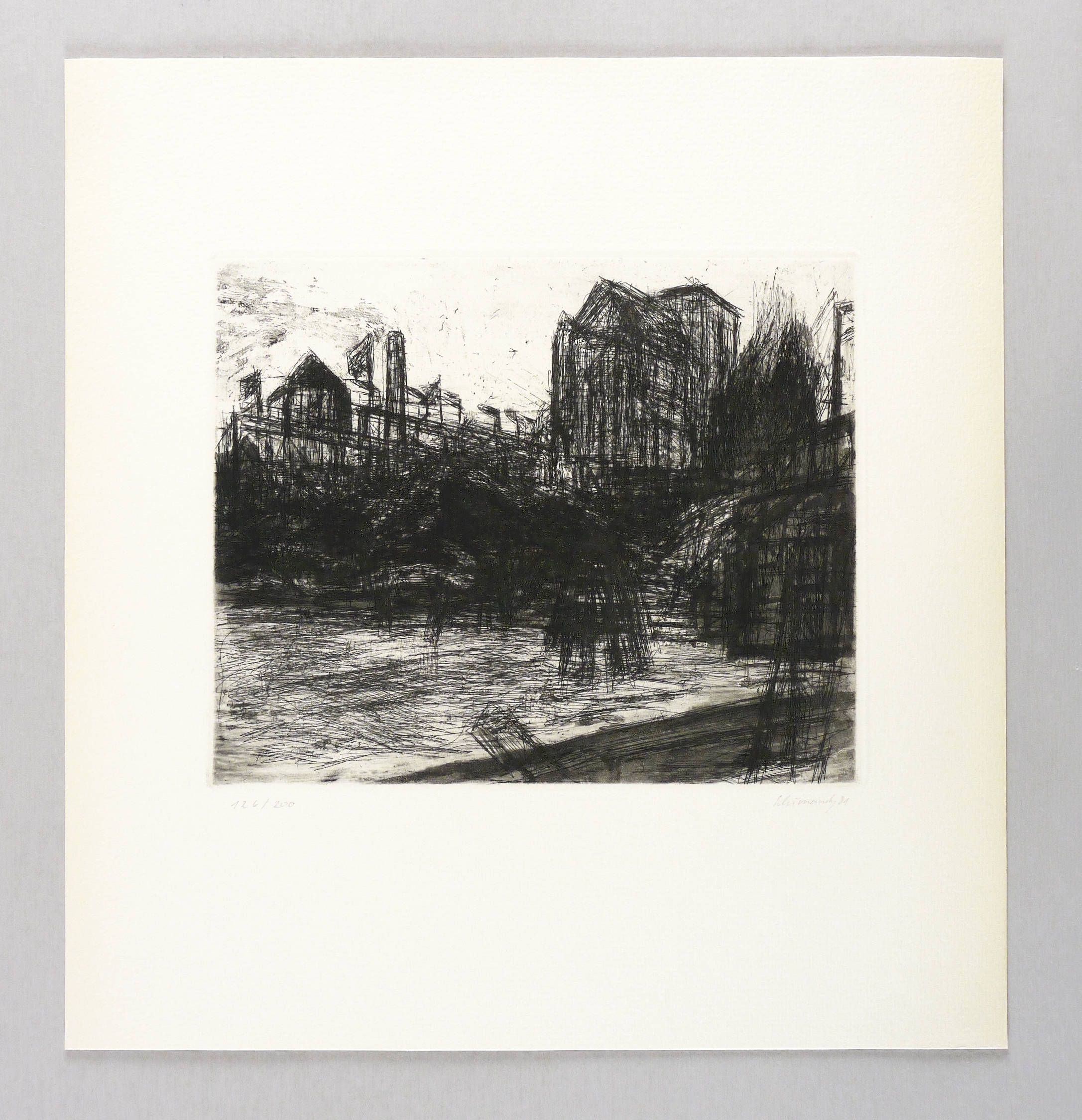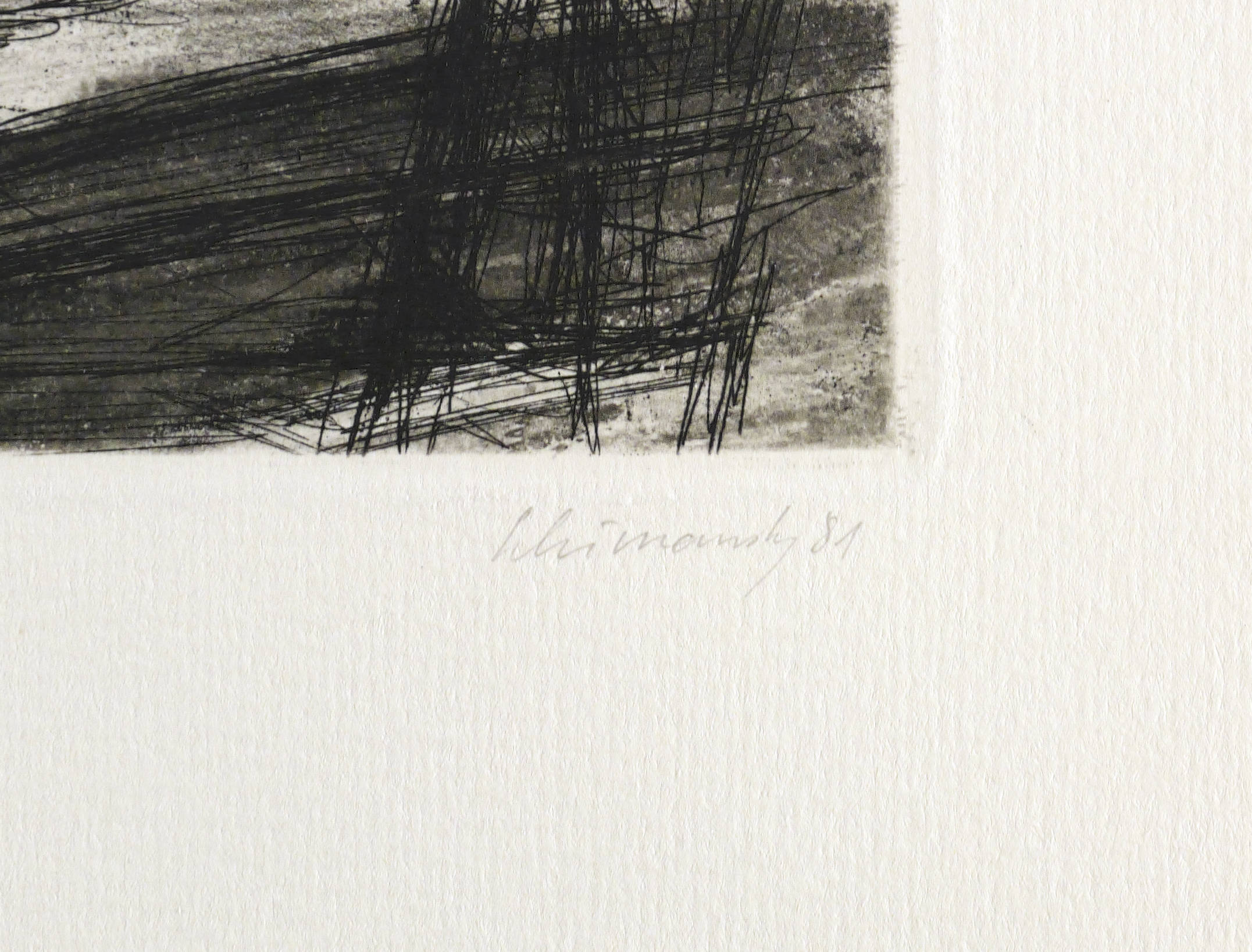 1981. Radierung / Strichätzung & Aquatinta, in Schwarz, auf hellchamois Kupferdruck. – Originale Künstlergrafik, von Hanns Schimansky. – Probedruck. – 20,1 x 24,3 cm (Darstellung / Platte), 38 x 35 cm (Blatt).