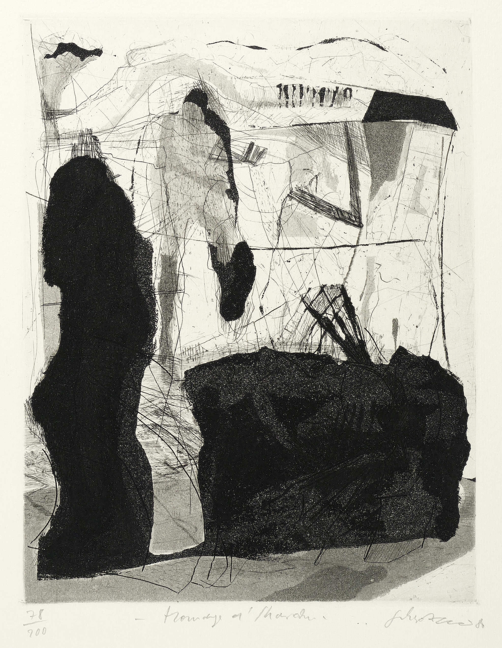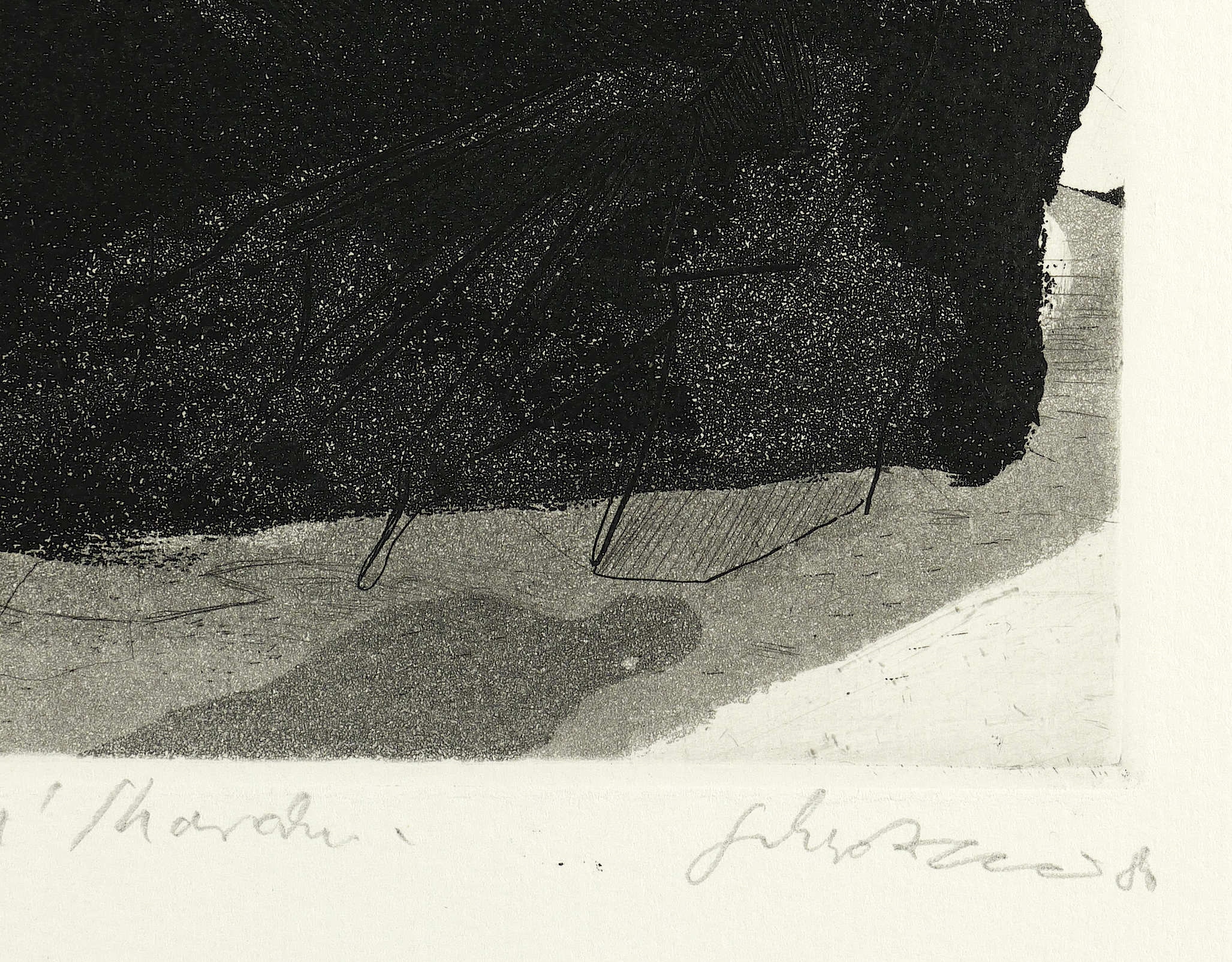 1986. Radierung / Strichätzung & Aquatinta, in Schwarz, auf hartem hellgelbem Maschinenbütten. – Originale Künstlergrafik, von Bernd Schlothauer. – Auflage Exemplar Nr. 78/200. – 26,8 x 20,7 cm (Darstellung / Platte), 36 x 31 cm (Blatt).
