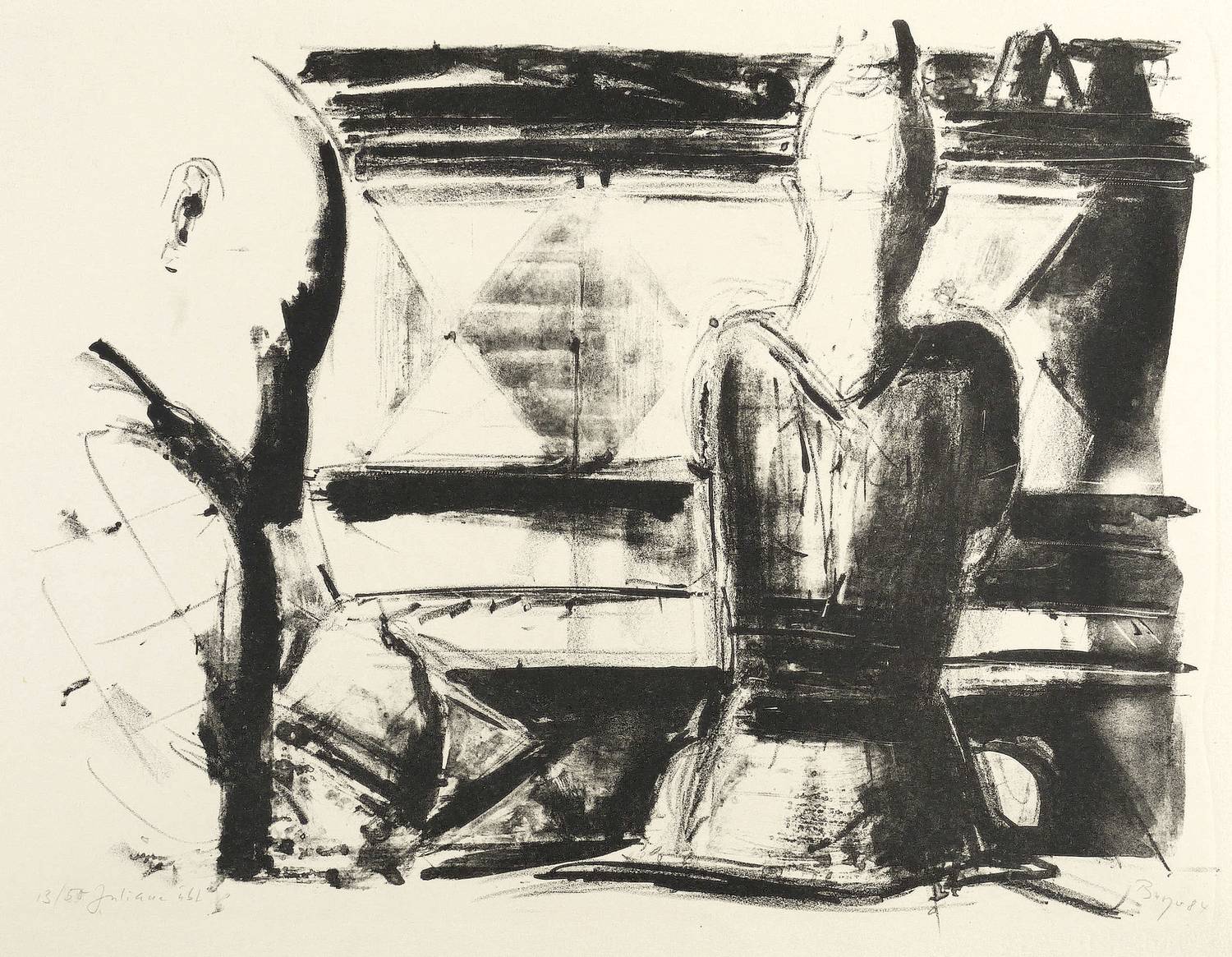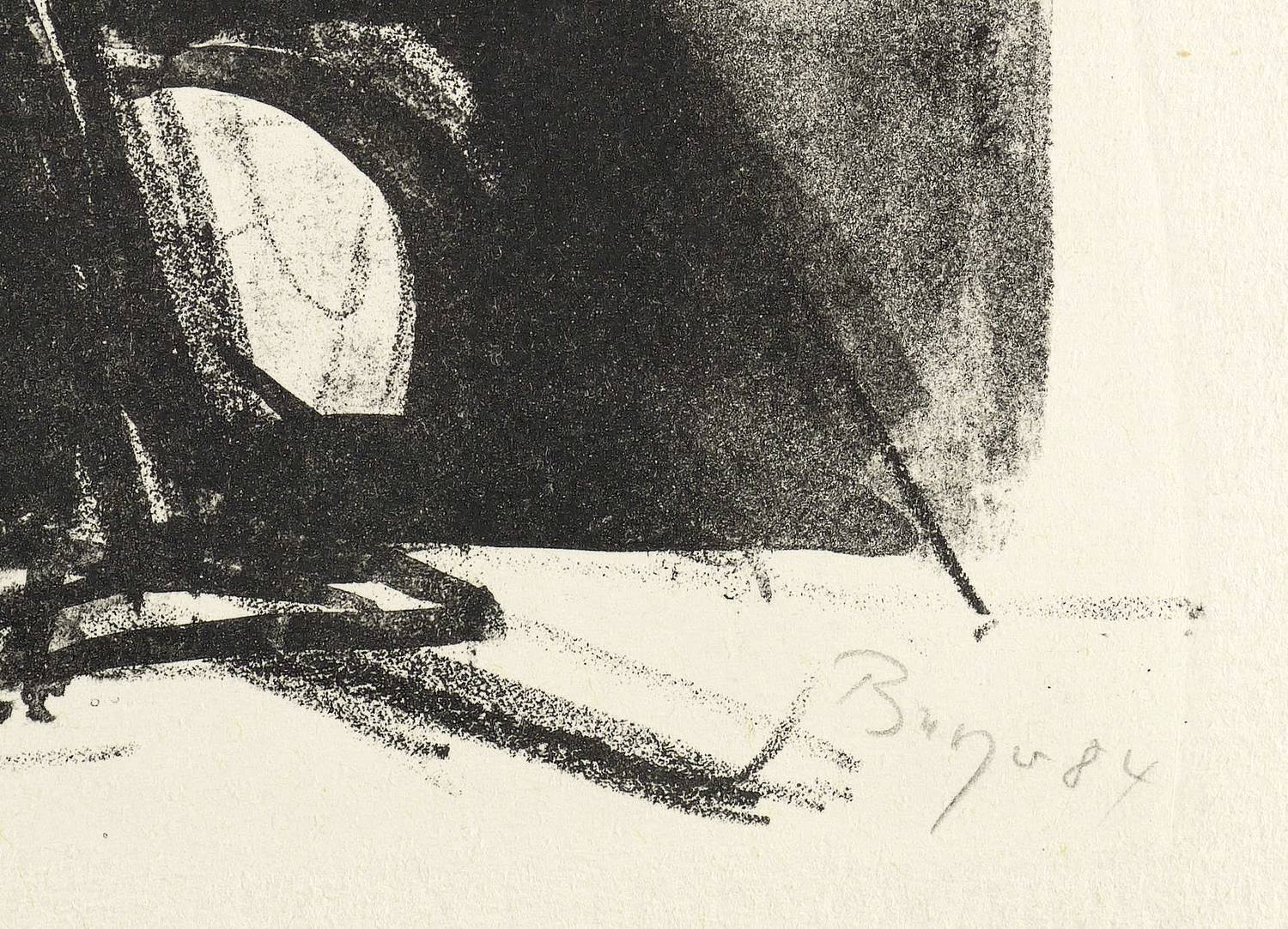 1984. Lithografie / Kreide- & Pinsellithografie, in Schwarz, auf gelbem Hahnemühle-Bütten. – Originale Künstlergrafik, von Dietrich Burger. – Auflage Exemplar Nr. 13/50. – 35,2 x 46,0 cm (Darstellung), 40 x 56 cm (Blatt).