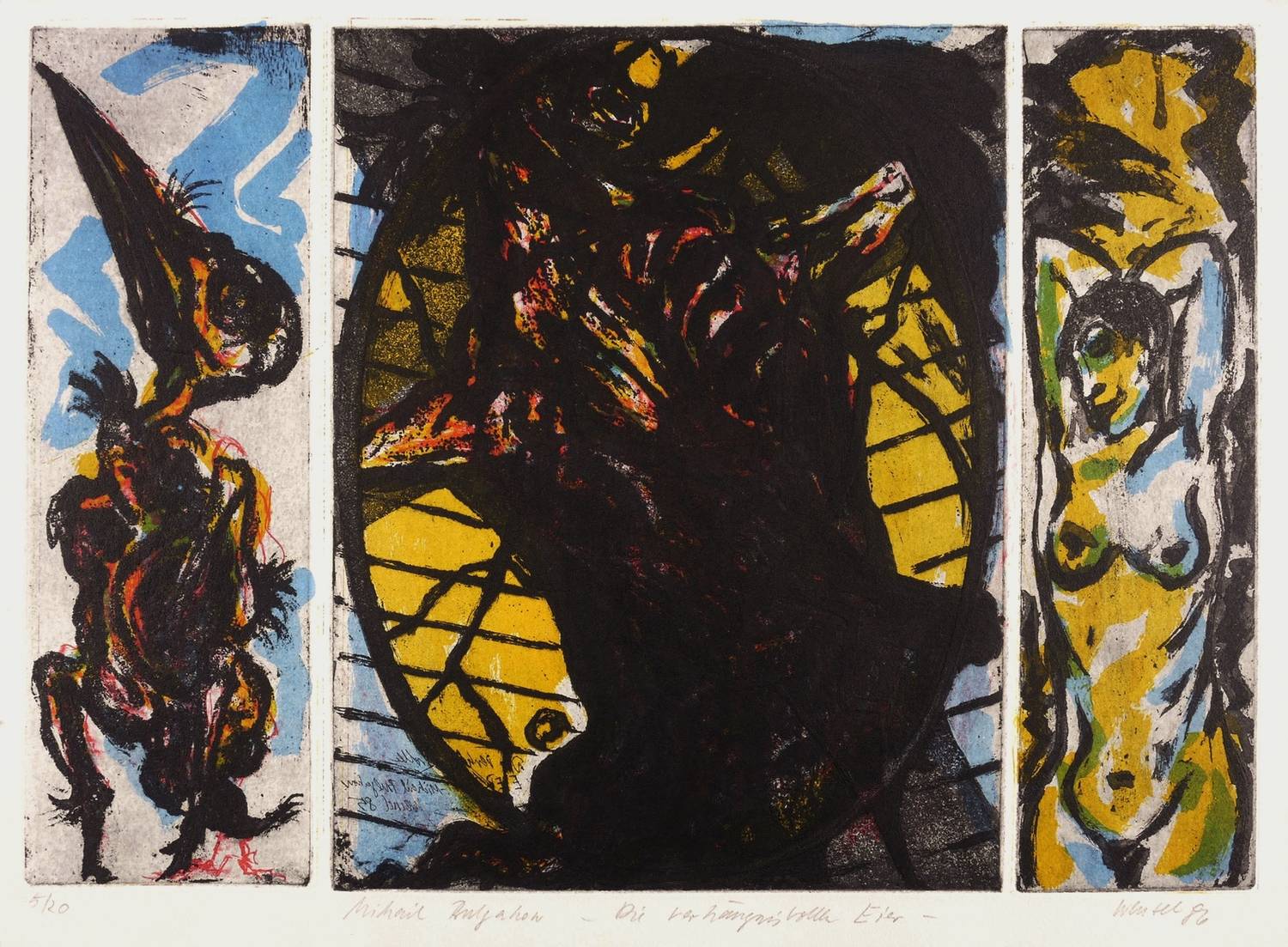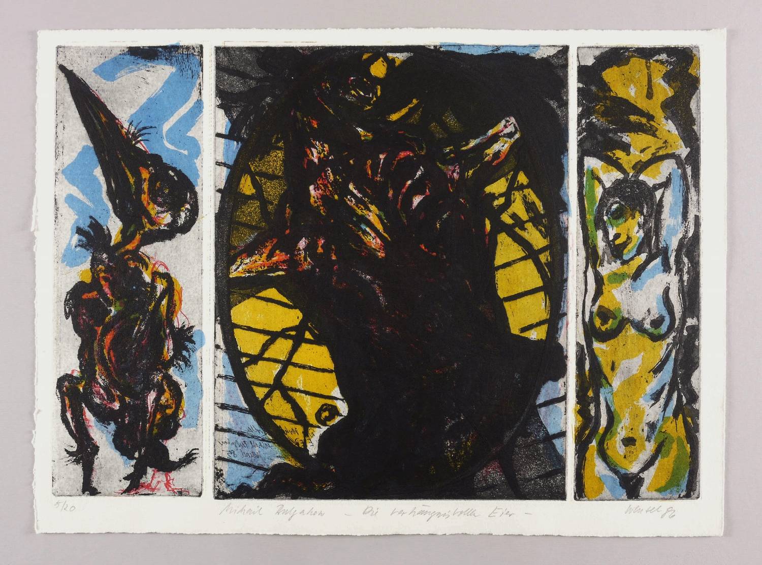 Rechts unten in Bleistift signiert und datiert: ″Wenzel 86″. Links Auflagenbezeichnung: ″5/20″. Mittig Titel: ″Michail Bulgakow - Die verhängnisvollen Eier″. Wasserzeichen der Hahnemühle. – In Form eines Triptychon von 3 Platten gedruckt. – Tadellos. Sehr guter Zustand.