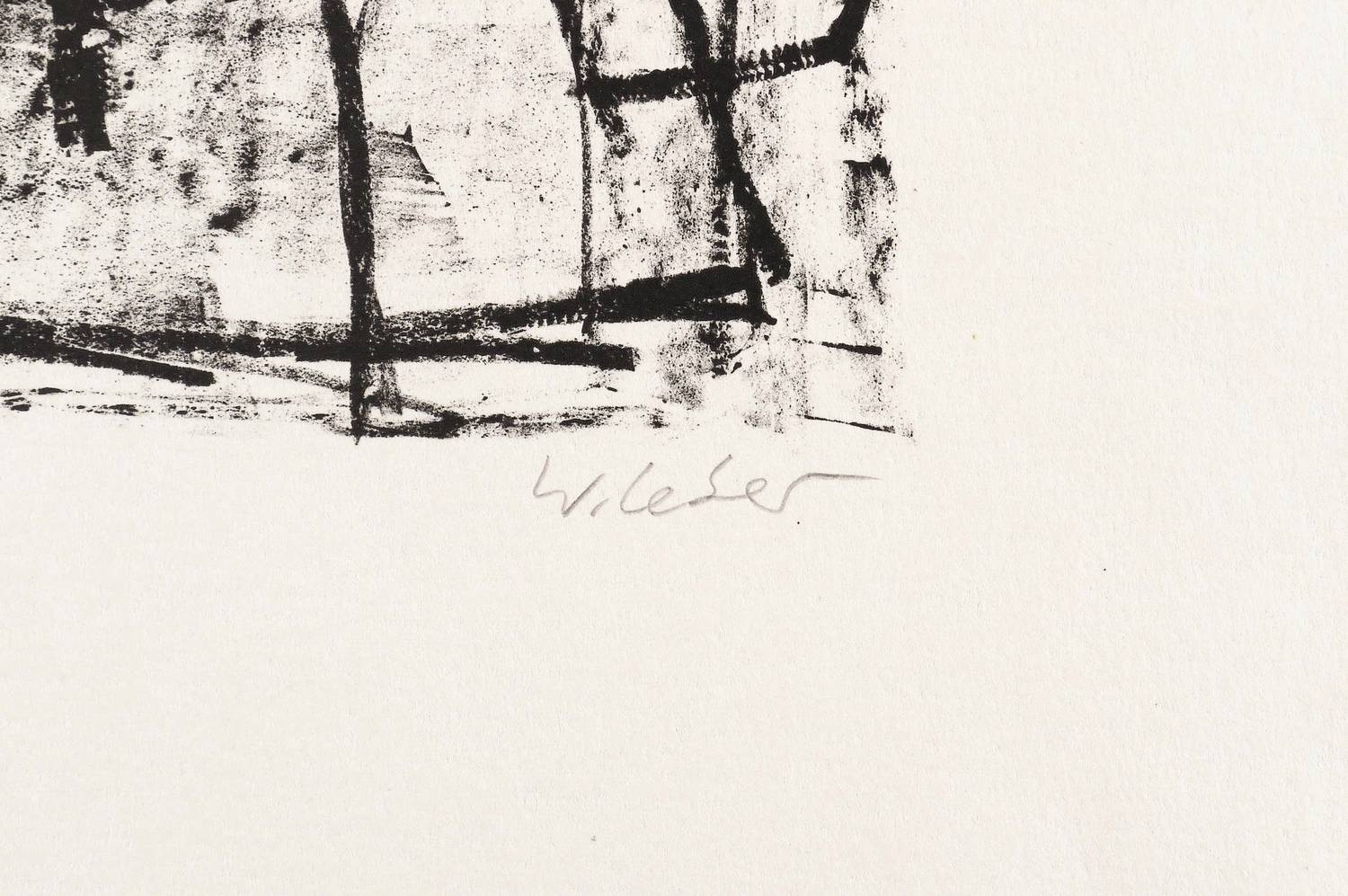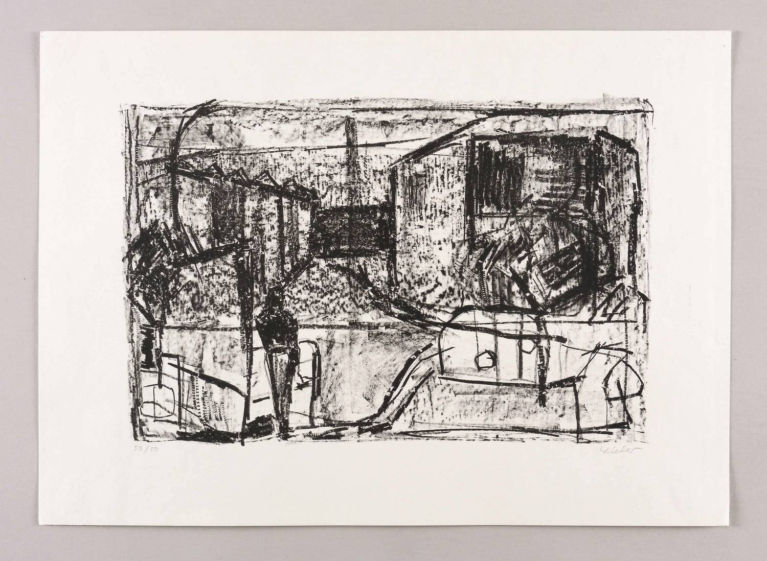 1980. Lithografie / Kreidelithografie, in Schwarz, auf glattem hellchamois Velinkarton. – Originale Künstlergrafik, von Wolfgang Leber. – Auflage Exemplar Nr. 50/50. – 24,7 x 37,5 cm (Darstellung / Druckbild), 35 x 49 cm (Blatt).