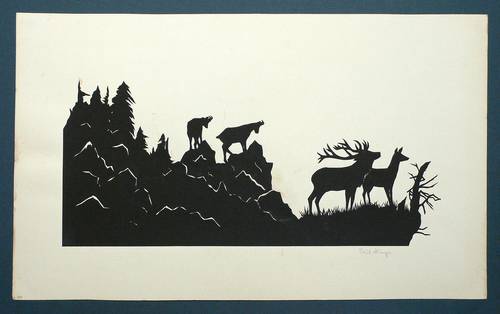 Um 1930. Scherenschnitt, in Schwarz, auf weißem Grund. – Originale Künstlergrafik, von Paul Hinze. – 17,5 x 40,0 cm (Darstellung), 30 x 50 cm (Blatt).