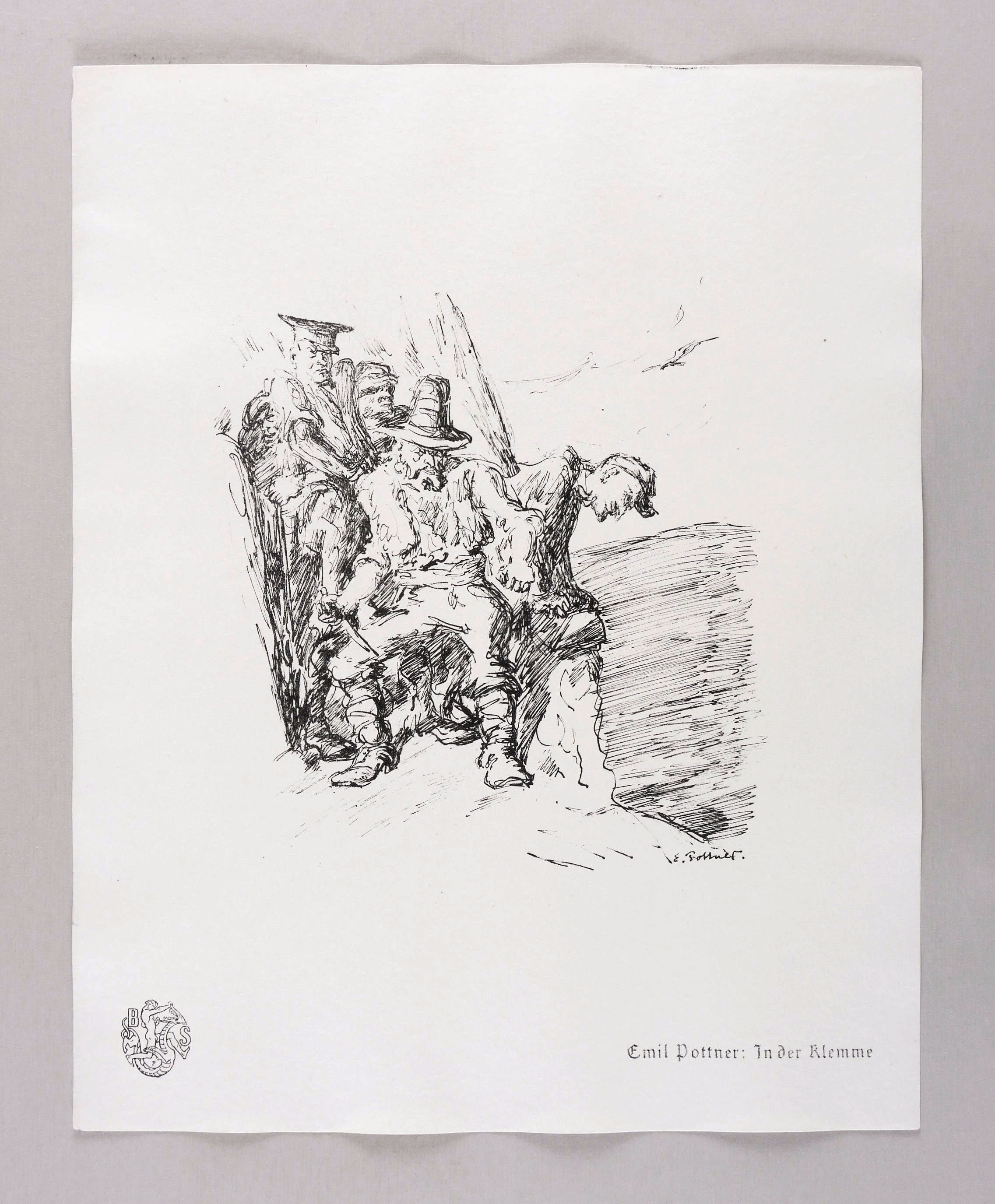 Aus: Krieg und Kunst. Original-Steinzeichnungen der Berliner Sezession (Berlin: Julius Bard 1915). – Nicht handsigniert. Im Stein rechts unten signiert: ″E. Pottner″. Am Blattrand rechts unten typografisch bezeichnet: ″Emil Pottner: In der Klemme″. Links unten Vignette der Berliner Secession. – Sehr guter Zustand.