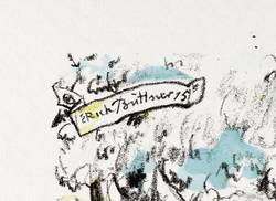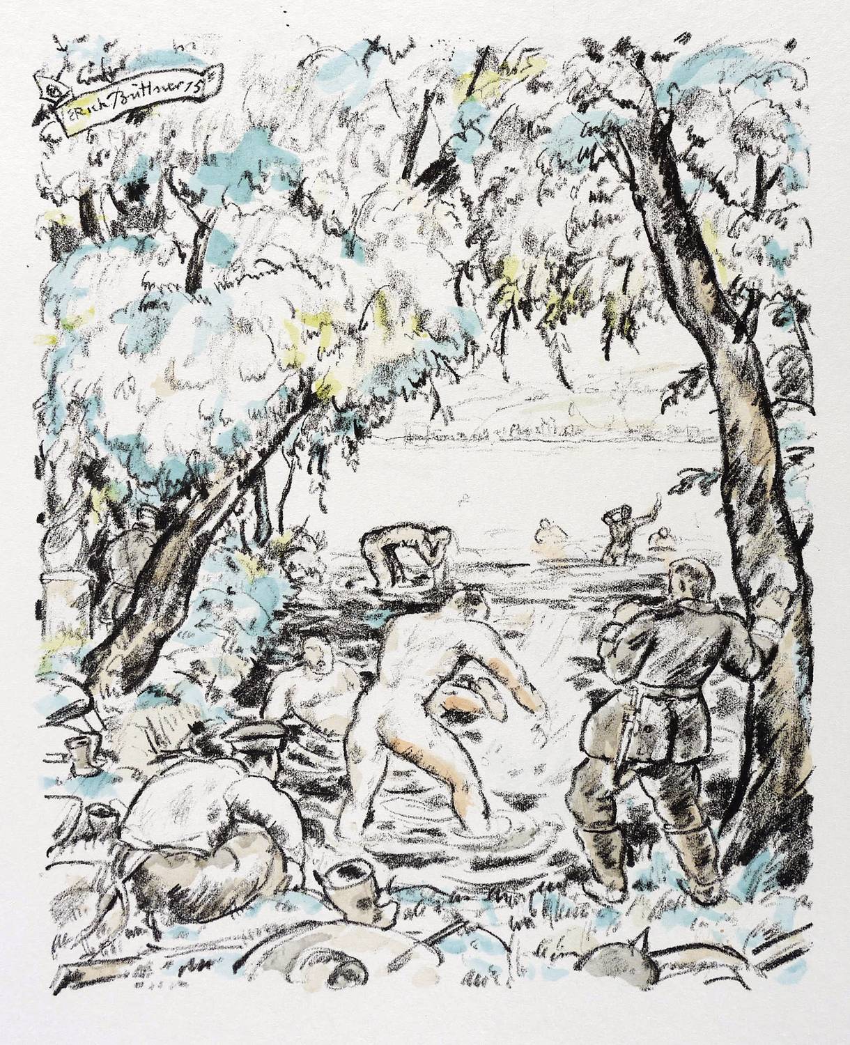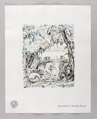 Aus: Krieg und Kunst. Original-Steinzeichnungen der Berliner Sezession (Berlin: Julius Bard 1915). – Nicht handsigniert. Im Stein signiert und datiert links oben im Schriftband: ″Erich Büttner 15″. Außerhalb des Steins rechts unten typografisch bezeichnet und betitelt: ″Erich Büttner: Badende Krieger″. Links unten Vignette der Berliner Sezession. – Originalrandiges Exemplar. Sehr guter Zustand.