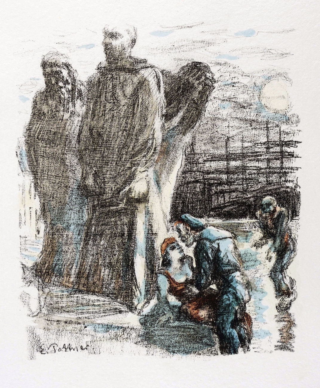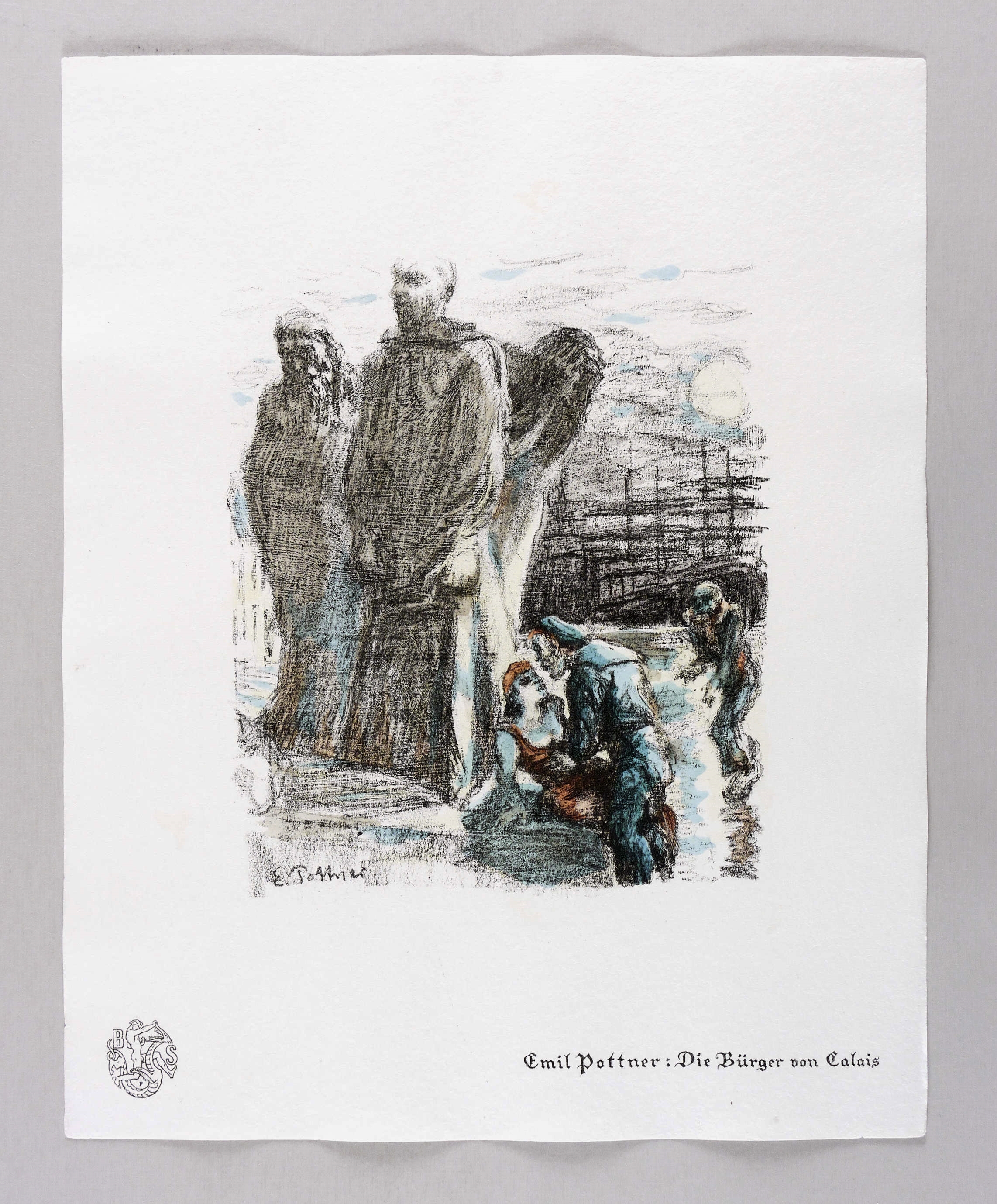 Aus: Krieg und Kunst. Original-Steinzeichnungen der Berliner Sezession (Berlin: Julius Bard 1915). – Nicht handsigniert. Im Stein signiert und datiert links unten: ″Emil Pottner″. Außerhalb des Steins rechts unten typografisch bezeichnet und betitelt: ″Emil Pottner: Die Bürger von Calais″. Links unten Vignette der Berliner Sezession. – Satirische Darstellung des 1885-89 von Auguste Rodin geschaffenen und 1895 am Place de l’hôtel de ville in Calais aufgestellten Denkmals ″Die Bürger von Calais (Le Monument aux Bourgeois de Calais)″. Zur Vorstellung einer angeblich verkommenen französischen Gesellschaft konfrontiert mit einigen zeitgenössischen ″Bürgern von Calais″, einer über den Platz wankenden Gestalt und einem Matrosen mit seiner Liebschaft. – Originalrandiges Exemplar. Sehr guter Zustand.