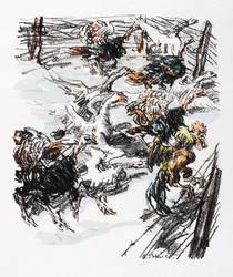 Aus: Krieg und Kunst. Original-Steinzeichnungen der Berliner Sezession (Berlin: Julius Bard 1916). – Nicht handsigniert. Im Stein rechts unten signiert und datiert: ″E. Pottner″. In der Blattecke rechts unten typografisch bezeichnet und betitelt: ″Emil Pottner: Sturmangriff″. Links unten Vignette der Berliner Sezession. – Originalrandiges Exemplar. Sehr guter Zustand.