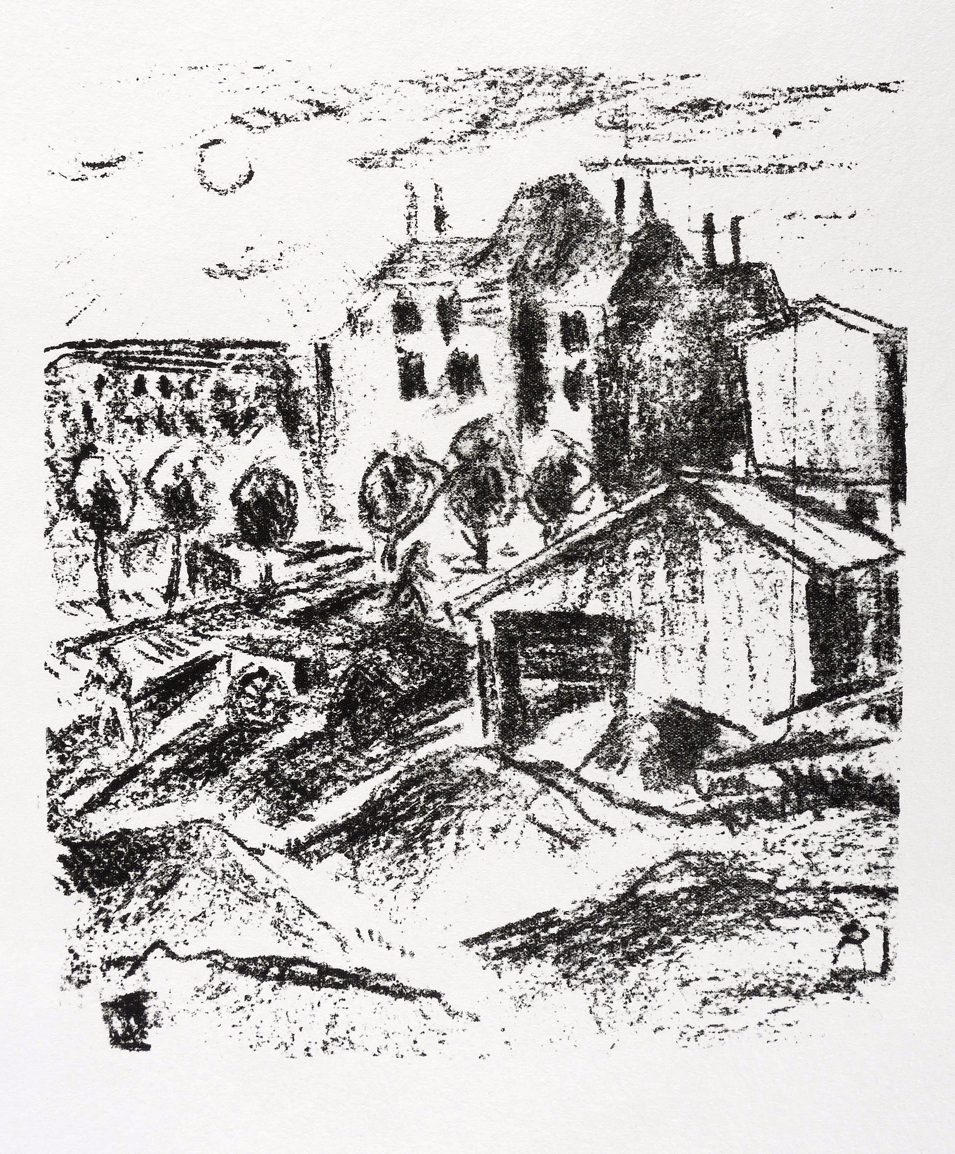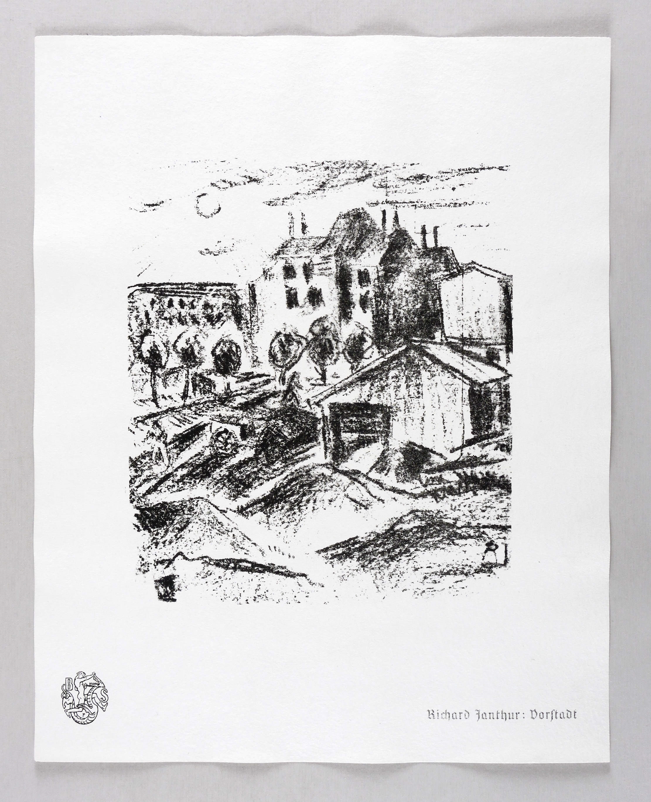 Aus: Krieg und Kunst. Original-Steinzeichnungen der Berliner Sezession (Berlin: Julius Bard 1915). – Nicht handsigniert. Am Blattrand rechts unten typografisch bezeichnet: ″Richard Janthur: Vorstadt″. Links unten Vignette der Berliner Secession. – Sehr guter Zustand.