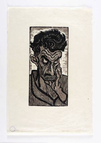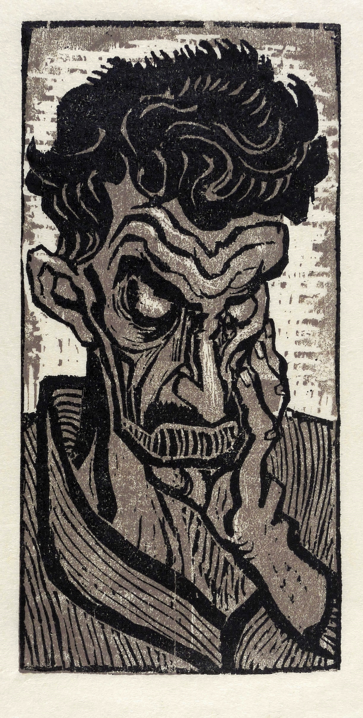 1947. Farbholzschnitt, in Braun & Schwarz, auf rauem gelbem Japan. – Originale Künstlergrafik, von Otto Pankok. – 30,5 x 15,1 cm (Darstellung / Druckstock), 49 x 33 cm (Blatt).