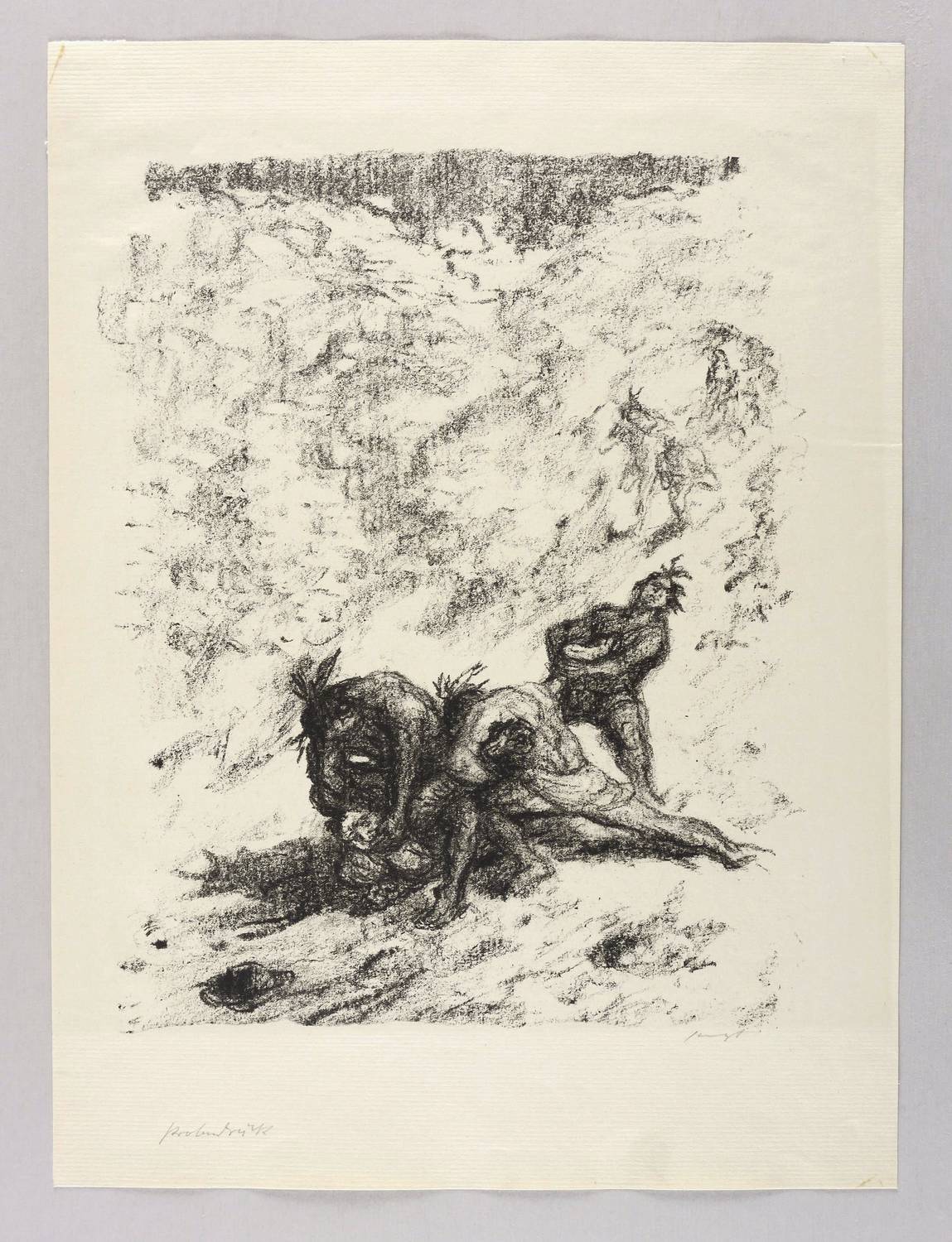 Sievers-Waldmann 103. – Aus: Max Slevogt, Lederstrumpf-Erzählungen (Berlin: Paul Cassirer 1908/1909). – Rechts unten in Bleistift signiert: ″Slevogt″. Links bezeichnet: ″Probedruck″. – In den äußersten Blattecken etwas fleckig. Insgesamt aber guter Zustand.