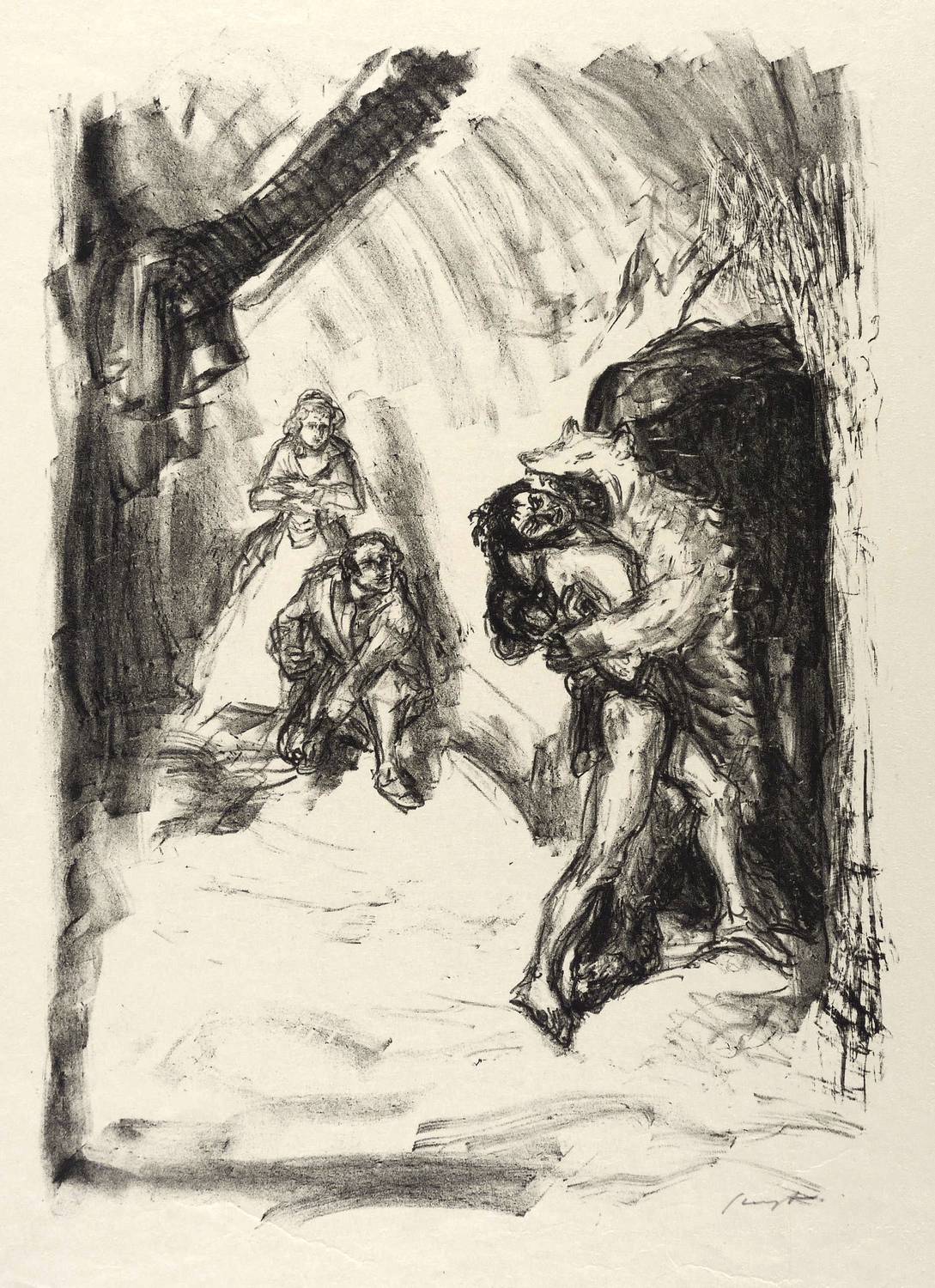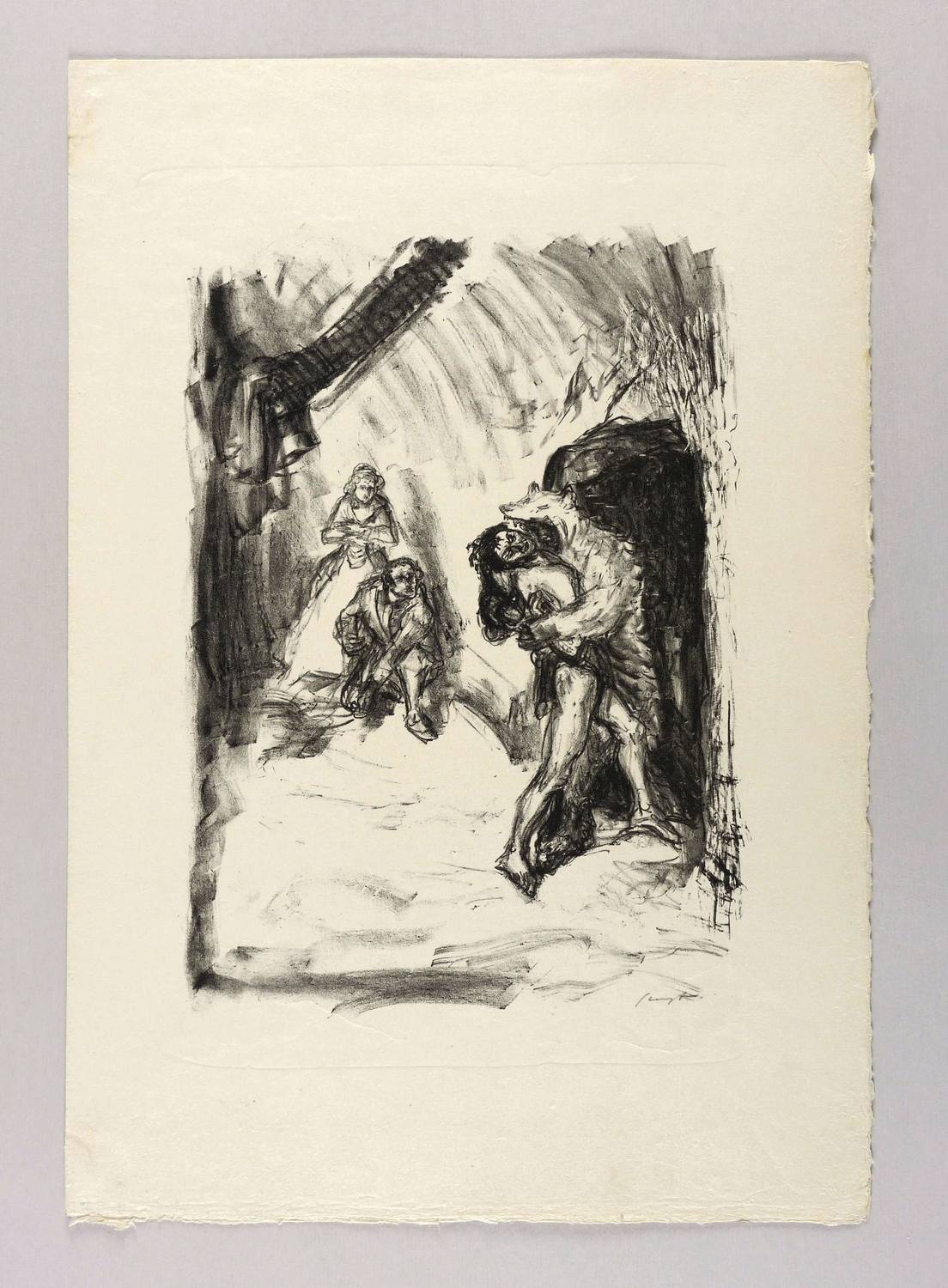 Slevogt, Max. – Lederstrumpf-Erzählungen. – „Falkenauge, als Bär vermummt, überwältigt Magua”.