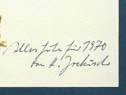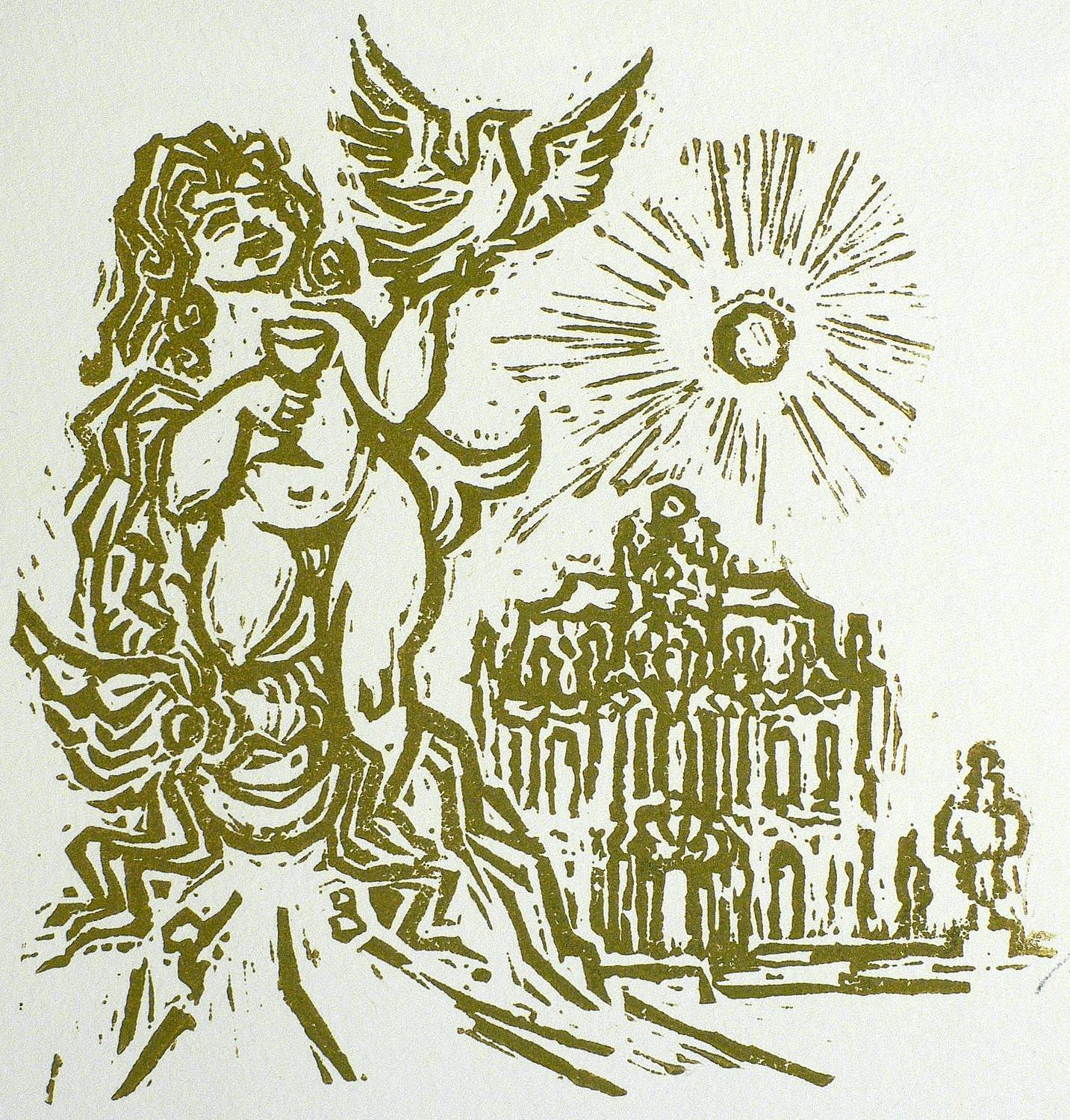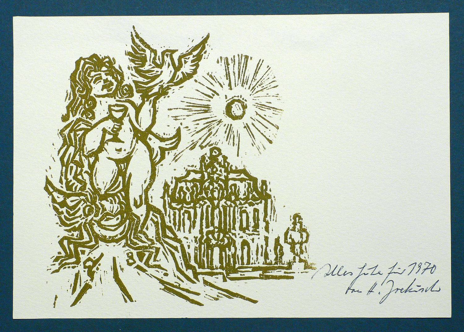 1970. Holzschnitt, in Ocker, auf hellgelbem Velin. – Originale Künstlergrafik, von Horst Jockusch. – 14,5 x 14,5 cm (Darstellung / Druckbild), 16 x 22 cm (Blatt).