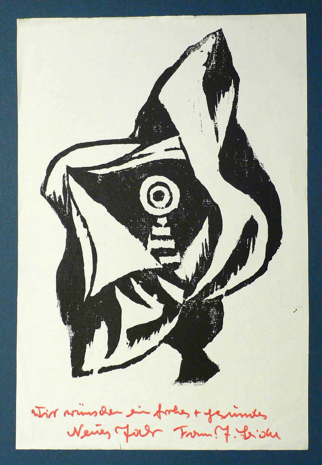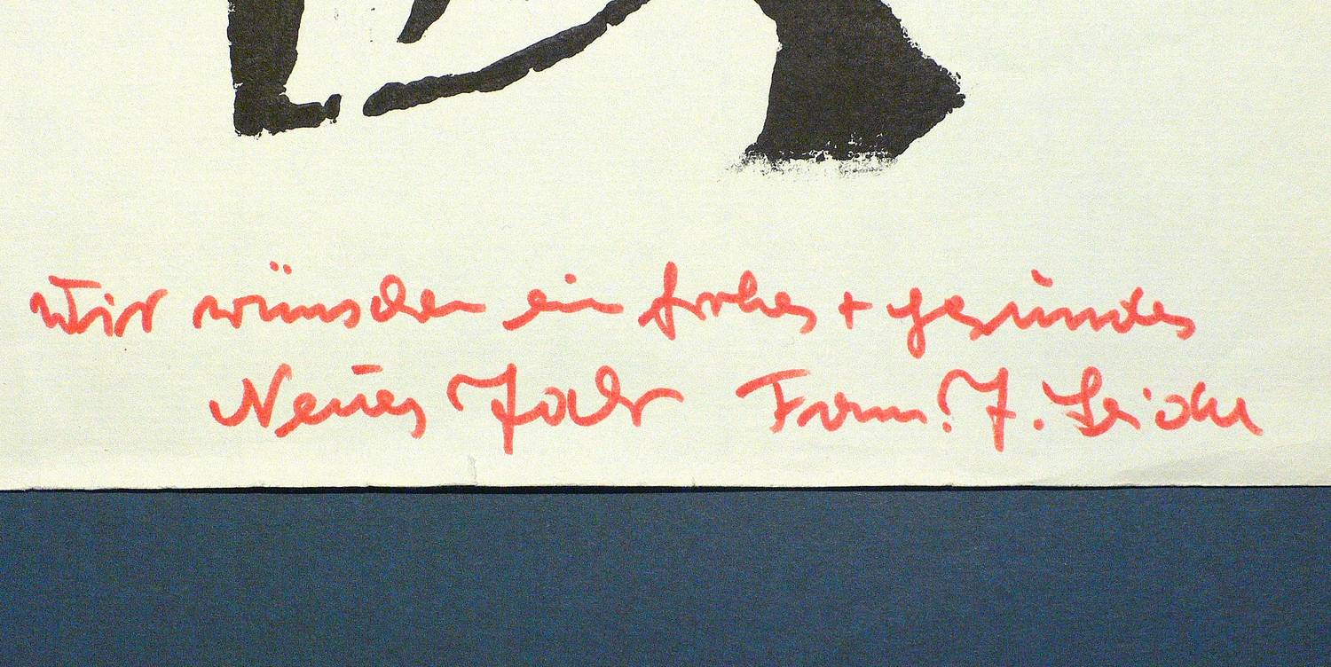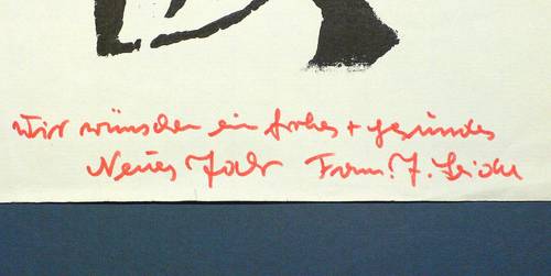Außerhalb der Darstellung in Filzstift bezeichnet und signiert ″Wir wünschen ein frohes + gemeinsames Jahr Fam. Seidel″. – Oberer und unterer Blattrand leicht bestoßen, knickspurig und mit winzigen Einrissen. Insgesamt gut erhalten.