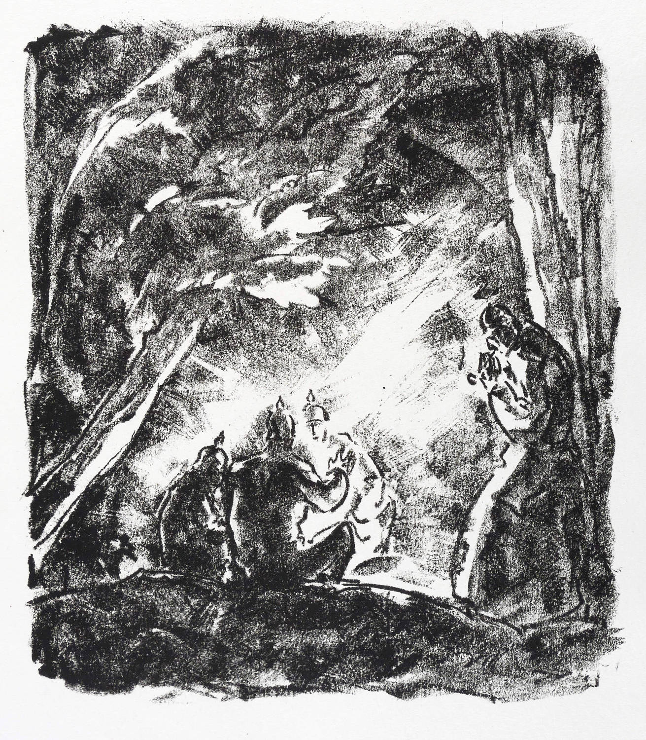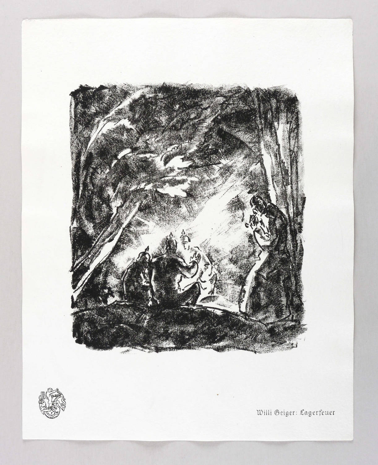 Aus: Krieg und Kunst. Original-Steinzeichnungen der Berliner Sezession (Berlin: Julius Bard 1915). – Nicht handsigniert. Am Blattrand rechts unten typografisch bezeichnet: ″Willi Geiger: Lagerfeuer″. Links unten Vignette der Berliner Secession. – Sehr guter Zustand.