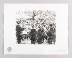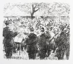 Aus: Krieg und Kunst. Original-Steinzeichnungen der Berliner Sezession (Berlin: Julius Bard 1915). – Nicht handsigniert. Im Stein links unten signiert: ″Paul Bach″. Im Blattrand rechts unten typografisch bezeichnet: ″Paul Bach: Feldmusik″. Links Signet der Berliner Secession. – Tadellos. Sehr guter Zustand.