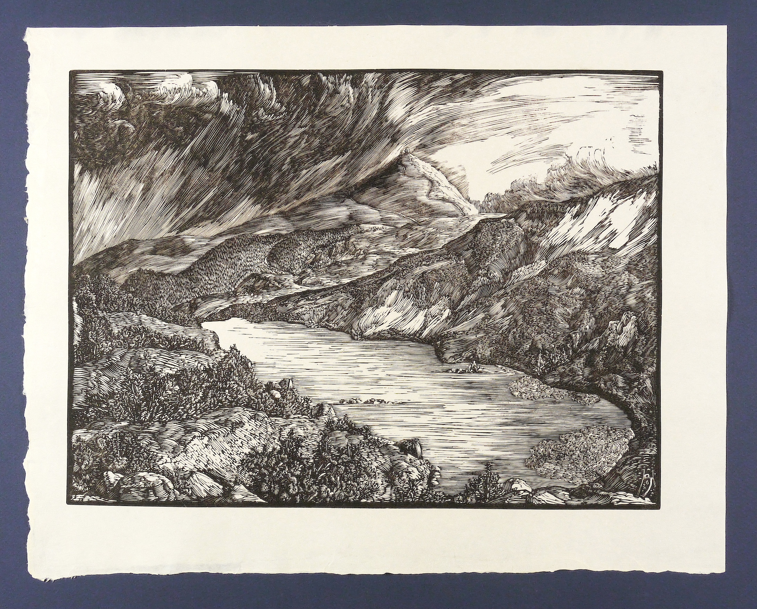 1926. Holzschnitt, in Schwarz, auf feinem hellem Büttenpapier. – Originale Künstlergrafik, von Hans Otto Schönleber. – 33,6 x 45,5 cm (Darstellung / Einfassungslinie), 42 x 54 cm (Blatt).