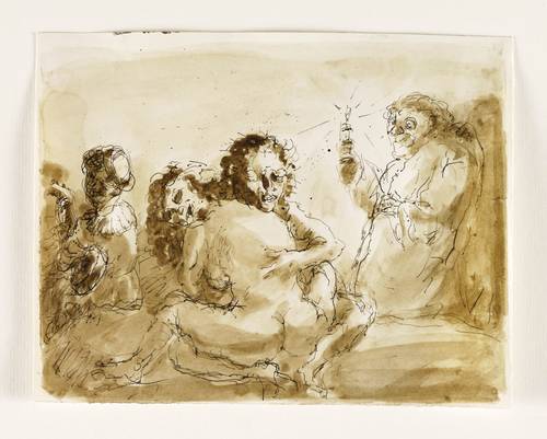 Rechts unten in Bleistift signiert: ″John″. Verso ausführlich bezeichnet. – Illustration zu der Macchiavelli-Edition ″Verführung auf toscanisch. Zeichnungen zu Machiavellis Komödie Mandragola″ von Joachim John, herausgegeben von Werner Stockfisch (Schwerin: Stock und Stein 1996). – Rückseitig Klebe- und Papierreste einer Montierung. Sonst sehr guter Zustand.