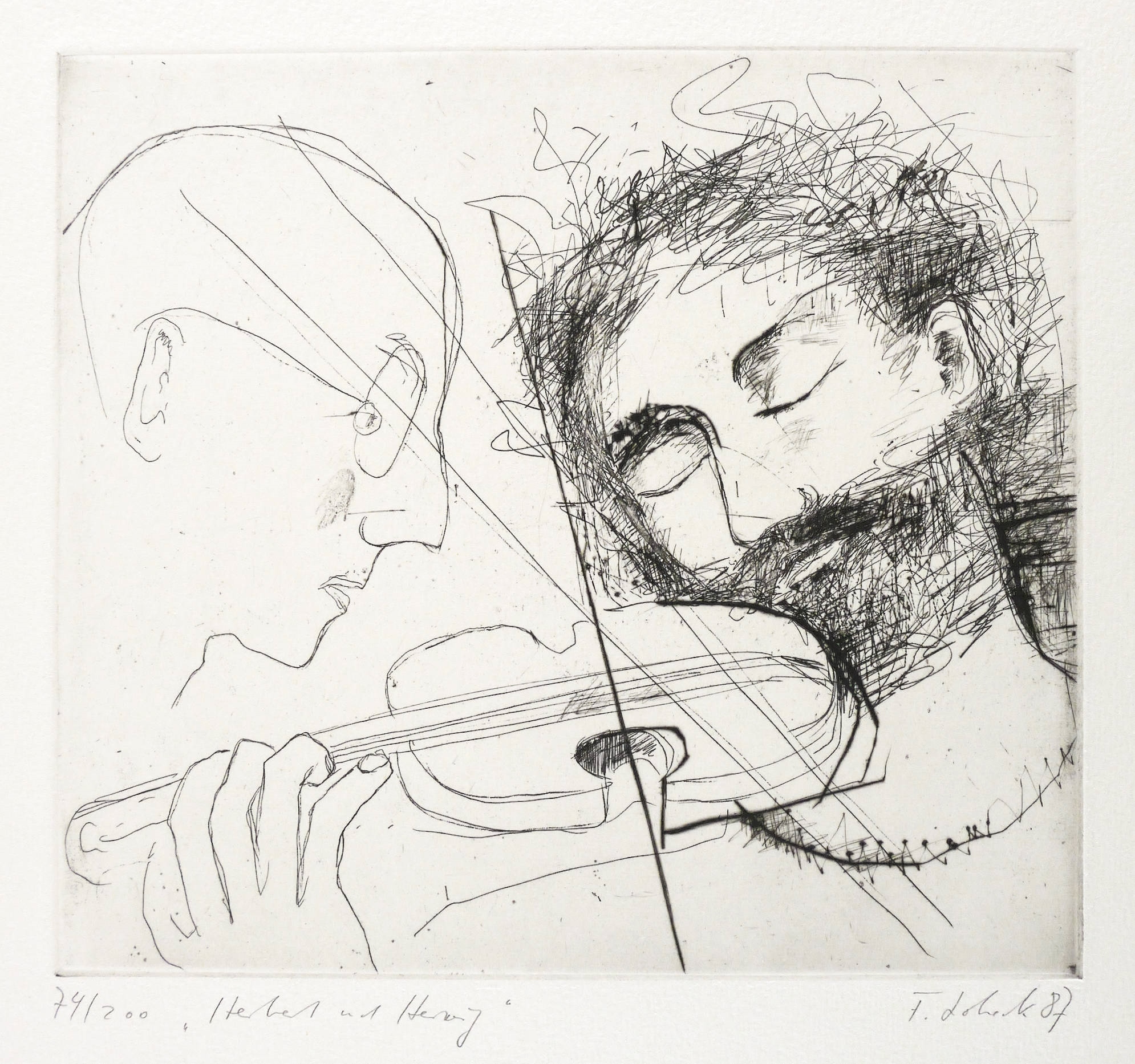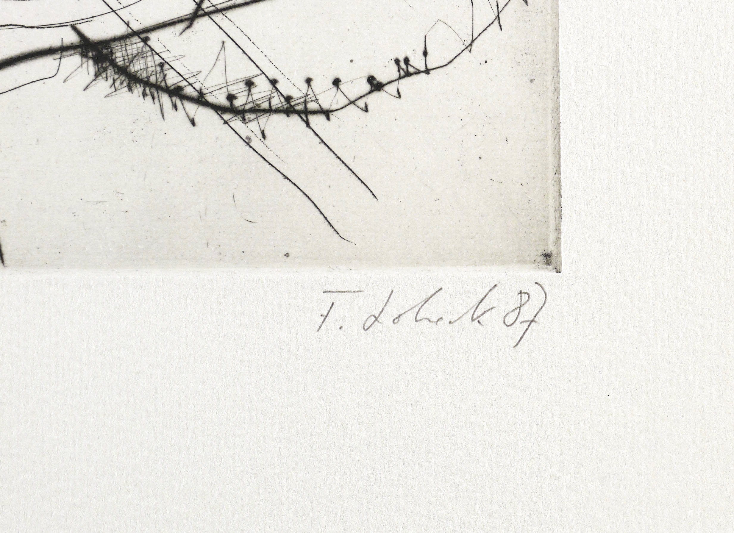 1987. Radierung / Strichätzung & Kaltnadel, in Schwarz, auf hartem hellchamois Weißenborn. – Originale Künstlergrafik, von Franziska Lobeck. – Auflage Exemplar Nr. 74/200. – 22,3 x 24,5 cm (Darstellung / Platte), 36 x 36 cm (Blatt).
