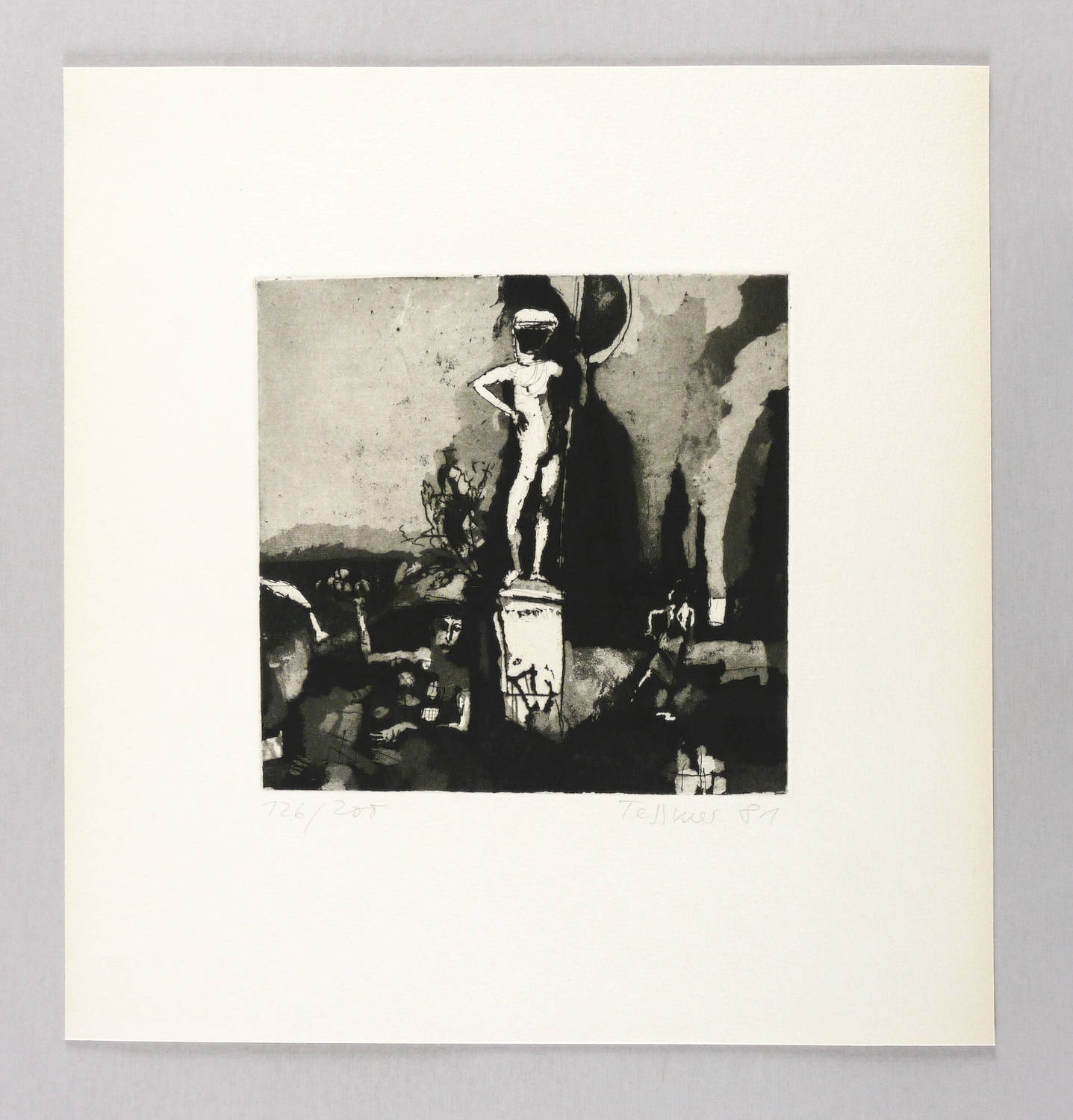 1981. Radierung / Aquatinta & Strichätzung, in Schwarz, auf hartem hellchamois Weißenborn. – Originale Künstlergrafik, von Heinrich Tessmer. – Auflage Exemplar Nr. 126/200. – 19,6 x 20,0 cm (Darstellung / Druckbild), 37 x 36 cm (Blatt).