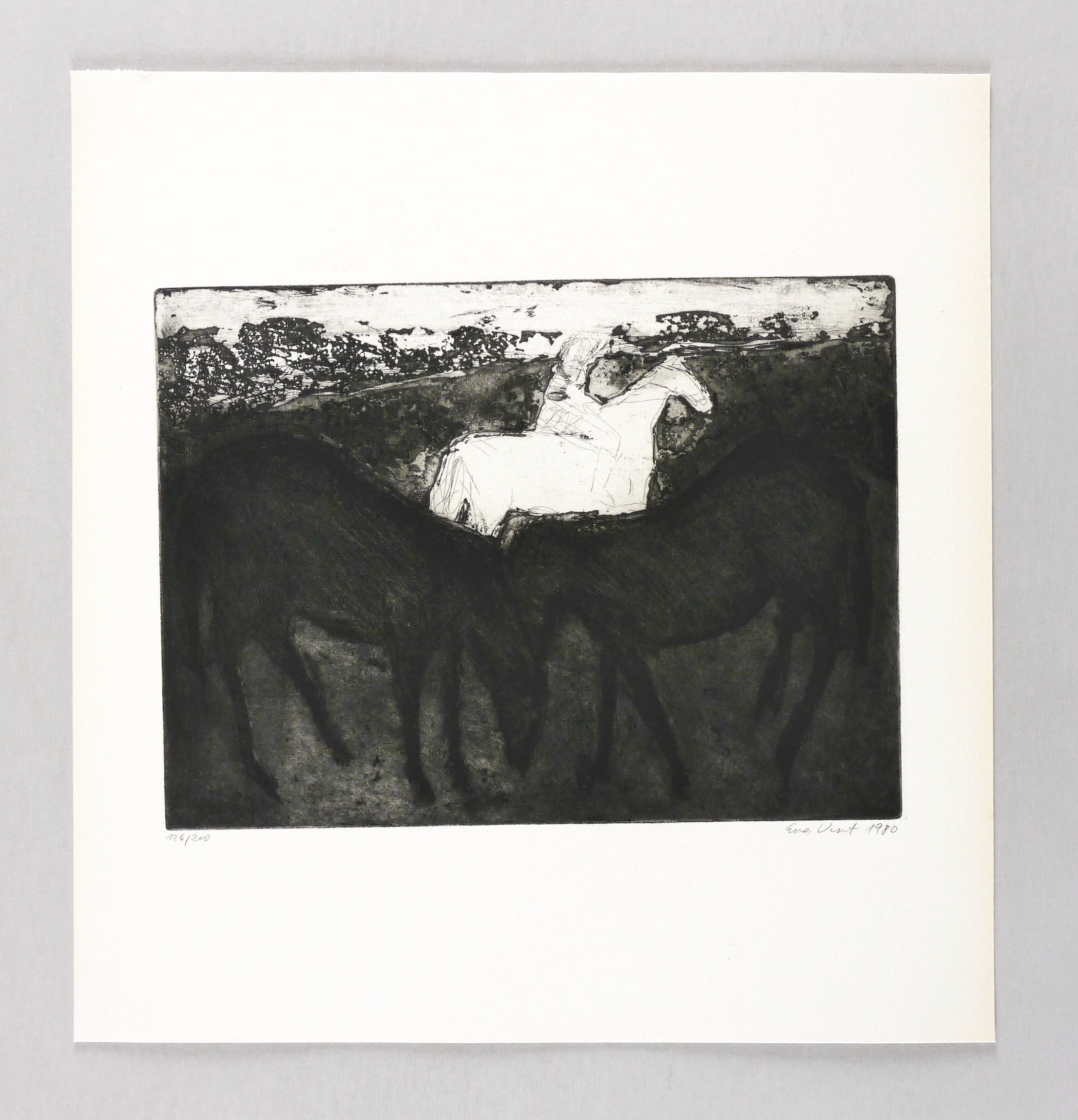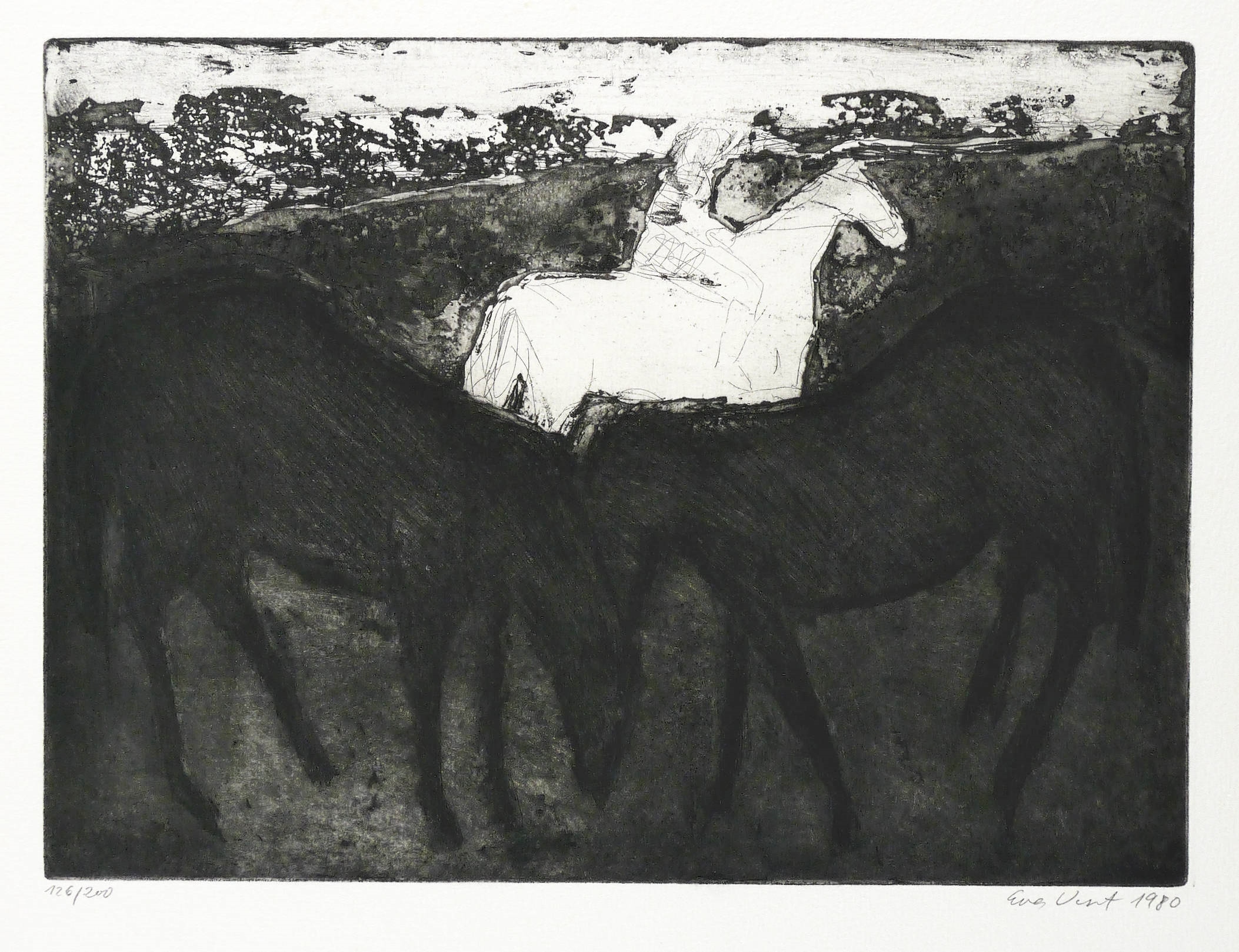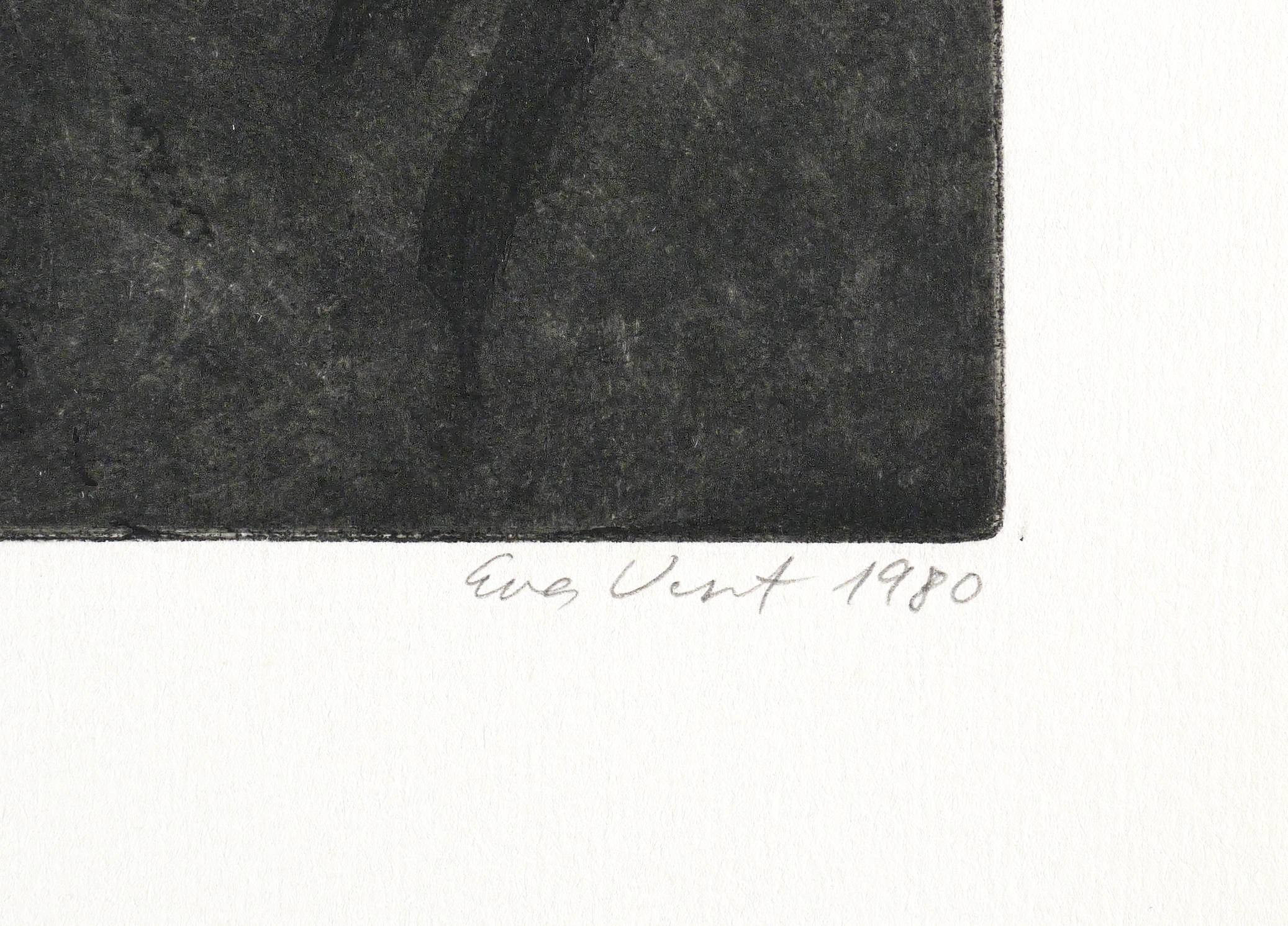 1980. Radierung / Strichätzung & Reservage, in Schwarz, auf hartem hellchamois Weißenborn. – Originale Künstlergrafik, von Eva Vent. – Auflage Exemplar Nr. 126/200. – 20,8 x 28,2 cm (Darstellung / Platte), 37 x 36 cm (Blatt).