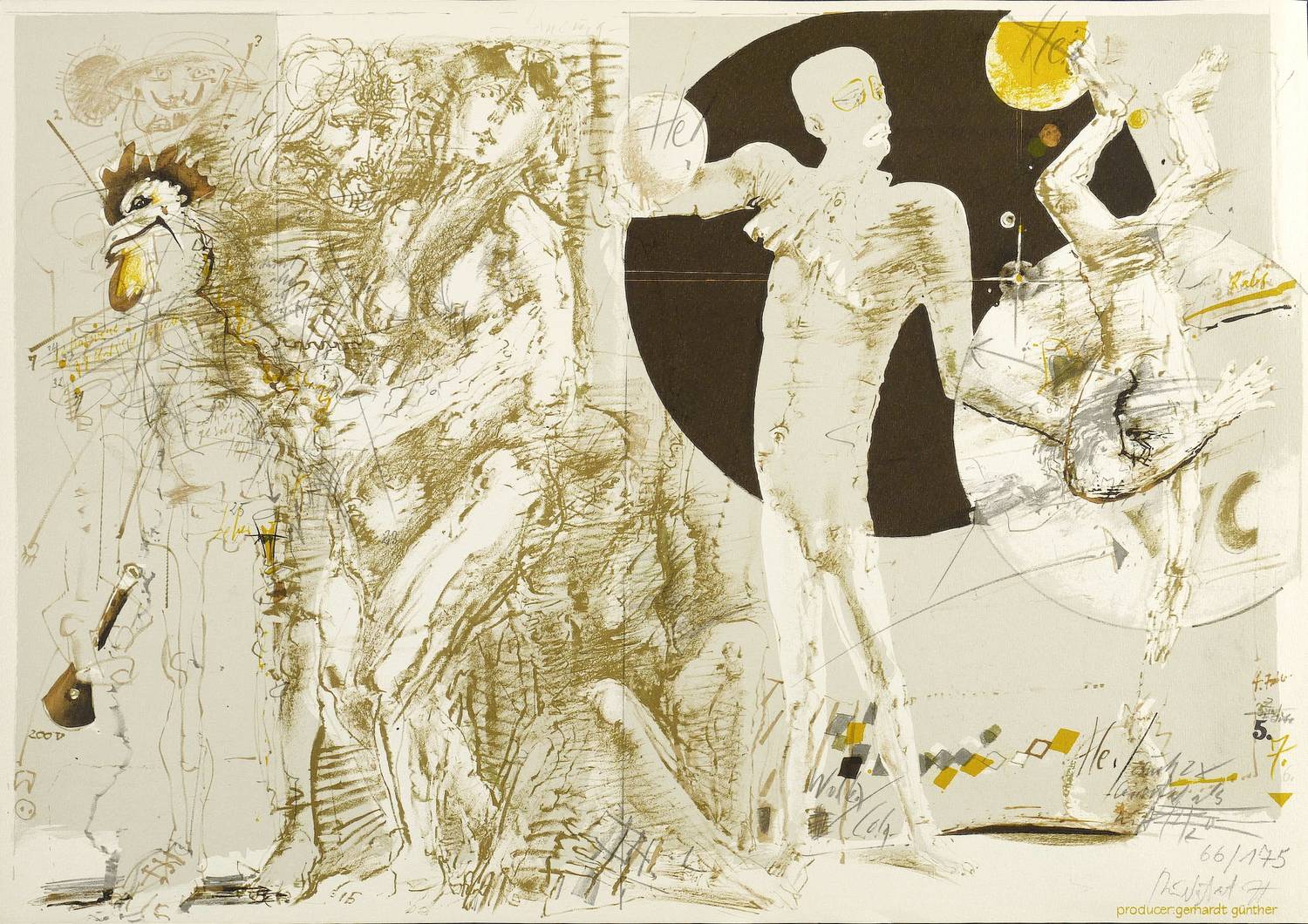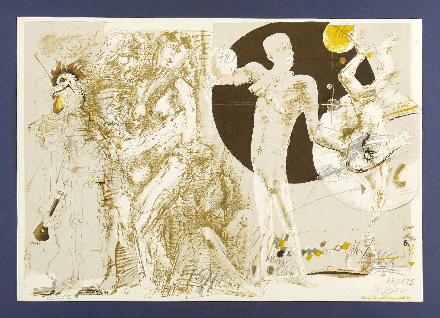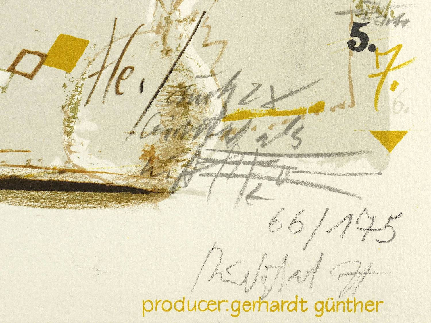 Rechts unten in Bleistift signiert und datiert: ″Ruddigkeit 77″. Dazu Auflagenbezeichnung. Im Stein diverse Inschriften: ″dancing // He! // Wodka-Cola // 4. Farbe″. Darunter typografisch bezeichnet: ″producer: gerhardt günther″. – Leichte Lagerspuren, Blattkanten und -ecken etwas bestoßen bzw. gestaucht. Insgesamt mäßig guter bis guter Zustand.