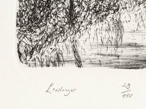 1986. Lithografie / Kreidelithografie, in Schwarz, auf hellchamois Hahnemühle-Bütten. – Originale Künstlergrafik, von Ernst Lewinger. – Auflage Exemplar Nr. 29/110. – 19,6 x 26,6 cm (Darstellung / Druckbild), 36 x 48 cm (Blatt).