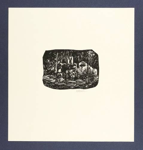 1966. Linolschnitt, in Schwarz, auf glattem hellchamois Karton. – Originale Künstlergrafik, von Hans Schulze. – 6,2 x 8,8 cm (Darstellung), 21 x 20 cm (Blatt).
