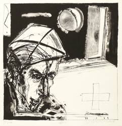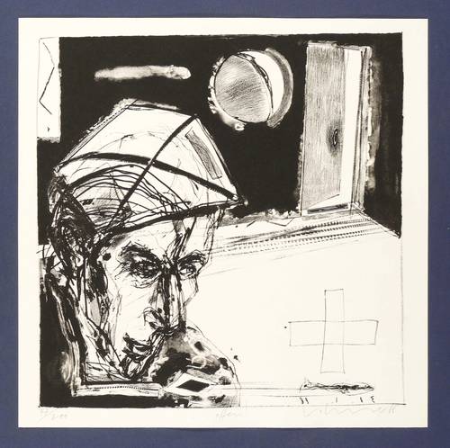 1988. Lithografie / Kreide- & Pinsellithografie, in Schwarz, auf hellgelbem Weißenborn-Bütten. – Von Steffen Volmer. – Auflage Exemplar Nr. 47/200. – 32,7 x 32,3 cm (Darstellung), 36 x 36 cm (Blatt).